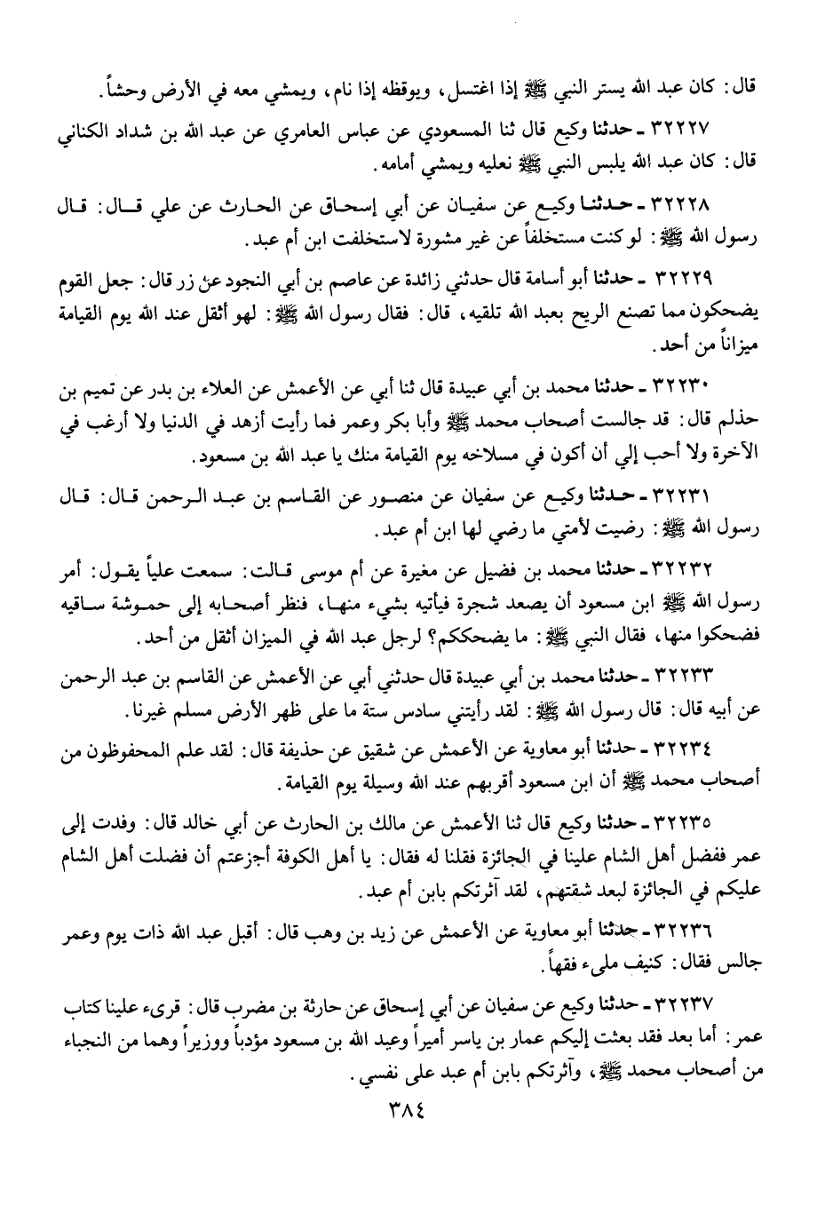32227 - حَدَّثَنَا وَكِيعٌ، قَالَ: ثنا الْمَسْعُودِيُّ، عَنْ عَيَّاشٍ الْعَامِرِيِّ، عَنْ عَبْدِ اللَّهِ بْنِ شَدَّادٍ الْكِنَانِيِّ، قَالَ: «كَانَ §عَبْدُ اللَّهِ يُلْبِسُ النَّبِيَّ صَلَّى اللهُ عَلَيْهِ وَسَلَّمَ نَعْلَيْهِ وَيَمْشِي أَمَامَهُ»