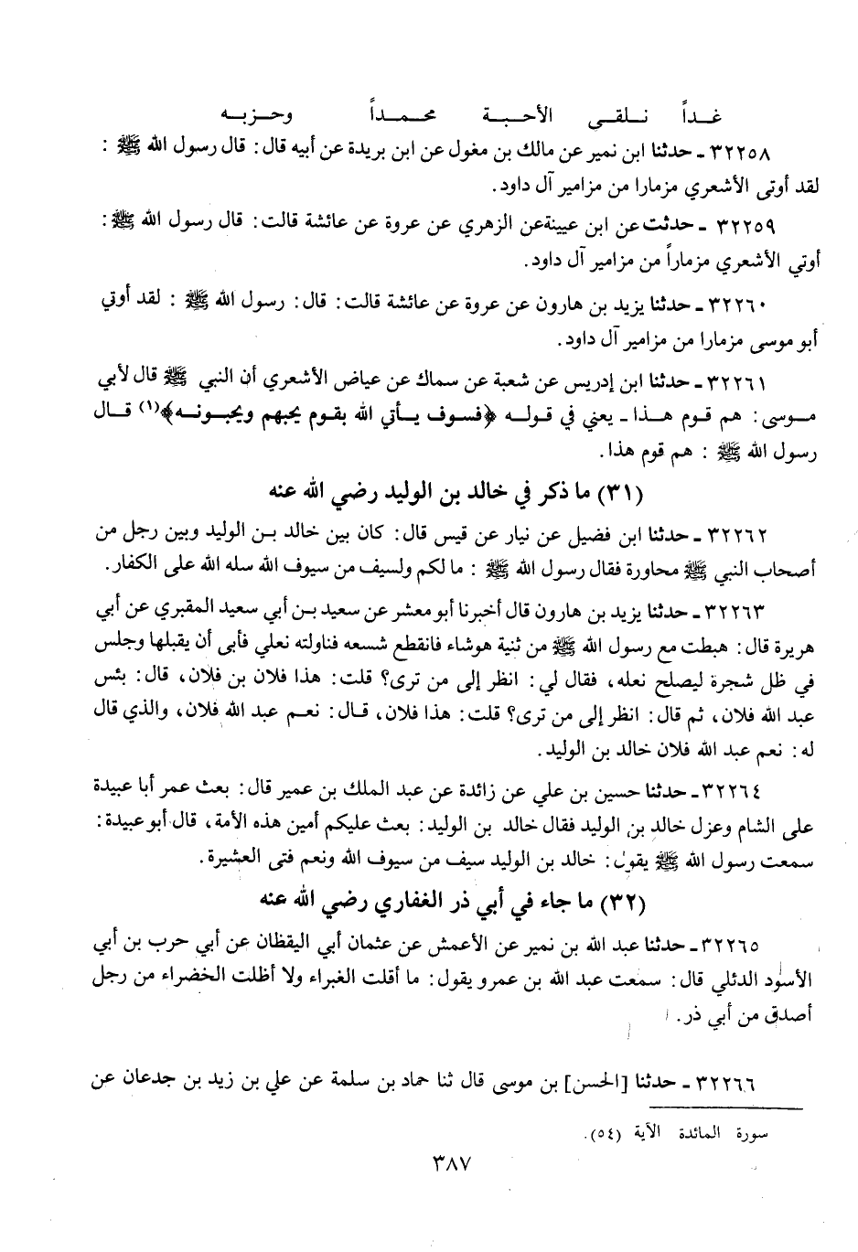 32260 - حَدَّثَنَا يَزِيدُ بْنُ هَارُونَ، عَنْ عُرْوَةَ، عَنْ عَائِشَةَ، قَالَتْ: قَالَ: رَسُولُ اللَّهِ صَلَّى اللهُ عَلَيْهِ وَسَلَّمَ: «§لَقَدْ أُوتِيَ أَبُو مُوسَى مِزْمَارًا مِنْ مَزَامِيرِ آلِ دَاوُدَ»