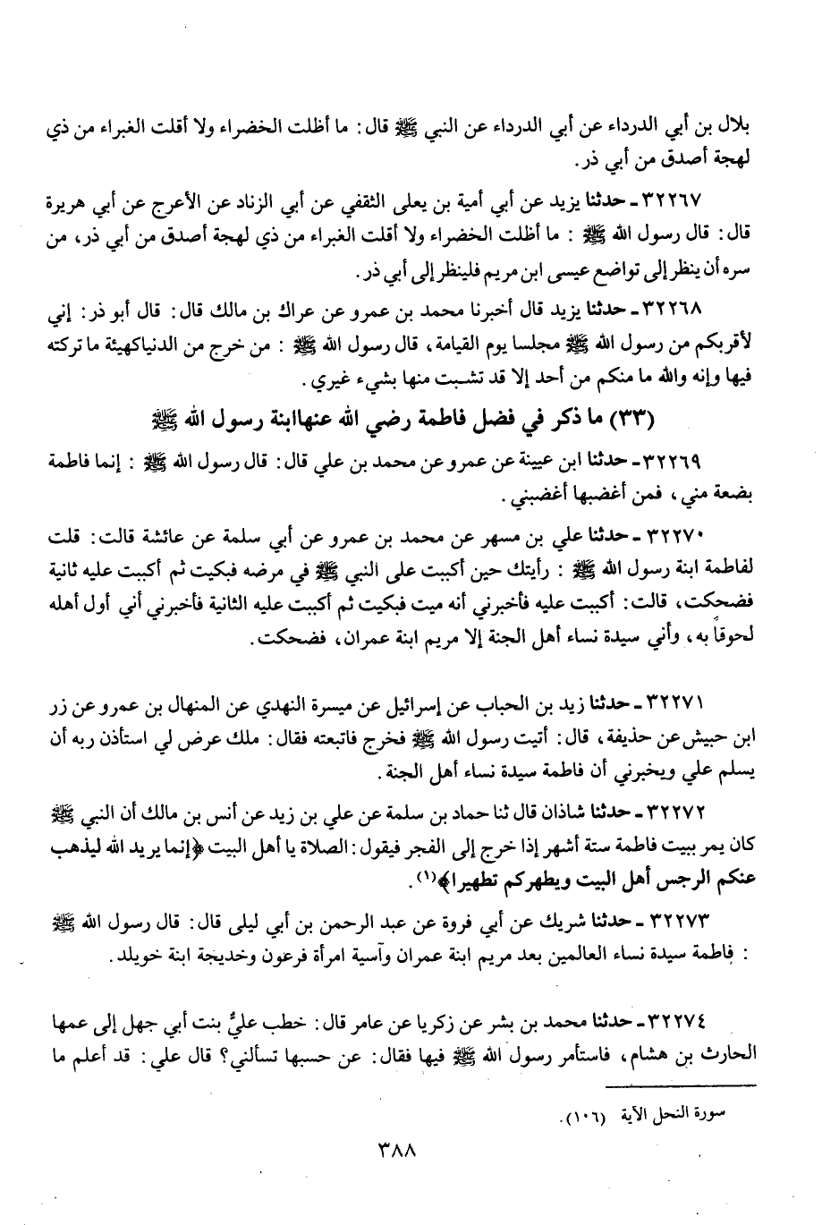 32271 - حَدَّثَنَا زَيْدُ بْنُ الْحُبَابِ، عَنْ إِسْرَائِيلَ، عَنْ مَيْسَرَةَ النَّهْدِيِّ، عنِ الْمِنْهَالِ بْنِ عَمْرٍو، عَنْ زِرِّ بْنِ حُبَيْشٍ، عَنْ حُذَيْفَةَ، قَالَ: أَتَيْتُ رَسُولَ اللَّهِ صَلَّى اللهُ عَلَيْهِ وَسَلَّمَ فَخَرَجَ فَاتَّبَعْتُهُ فَقَالَ: «مَلَكٌ عَرَضَ لِي اسْتَأْذَنَ رَبَّهُ أَنْ يُسَلِّمَ عَلَيَّ، وَيُخْبِرَنِي أَنَّ §فَاطِمَةَ سَيِّدَةُ نِسَاءِ أَهْلِ الْجَنَّةِ»