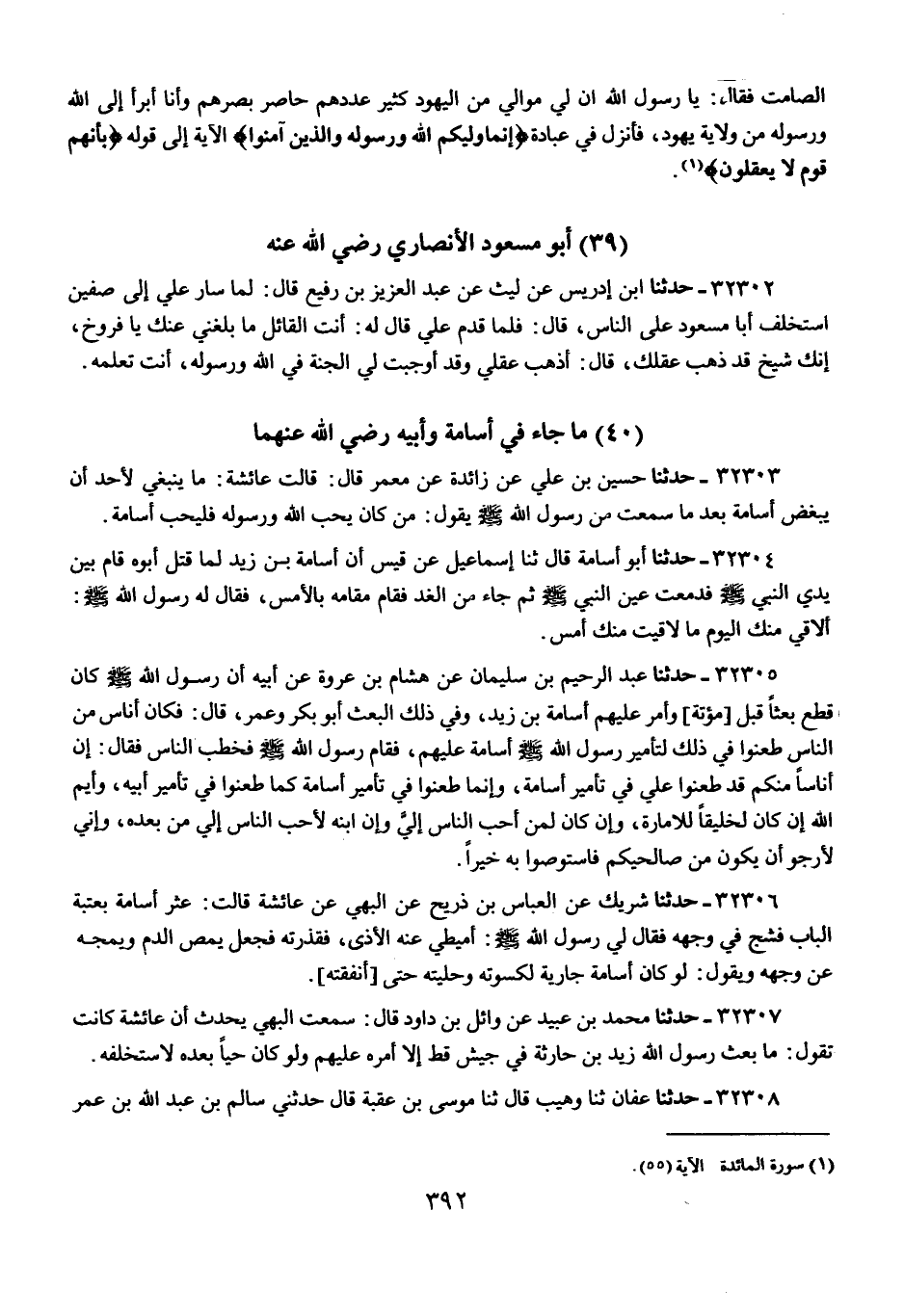 32303 - حَدَّثَنَا حُسَيْنُ بْنُ عَلِيٍّ، عَنْ زَائِدَةَ، عَنْ مُغِيْرَةَ، قَالَ: قَالَتْ عَائِشَةُ: مَا يَنْبَغِي لِأَحَدٍ أَنْ يُبْغِضَ أُسَامَةَ، بَعْدَمَا سَمِعْتُ مِنْ رَسُولِ اللَّهِ صَلَّى اللهُ عَلَيْهِ وَسَلَّمَ يَقُولُ: «§مَنْ كَانَ يُحِبُّ اللَّهَ وَرَسُولَهُ فَلْيُحِبَّ أُسَامَةَ»