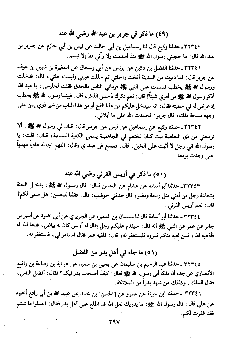 32341 - حَدَّثَنَا الْفَضْلُ بْنُ دُكَيْنٍ، عَنْ يُونُسَ، عَنْ أَبِي إِسْحَاقَ، عَنِ الْمُغِيرَةِ بْنِ شُبَيْلِ بْنِ عَوْفٍ، عَنْ جَرِيرٍ، قَالَ: لَمَّا دَنَوْتُ مِنَ الْمَدِينَةِ أَنَخْتُ رَاحِلَتِي، ثُمَّ حَلَلْتُ عَيْبَتِي، وَلَبِسْتُ حُلَّتِي، قَالَ: فَدَخَلْتُ وَرَسُولُ اللَّهِ صَلَّى اللهُ عَلَيْهِ وَسَلَّمَ يَخْطُبُ، فَسَلَّمْتُ عَلَى النَّبِيِّ صَلَّى اللهُ عَلَيْهِ وَسَلَّمَ، فَرَمَانِي النَّاسُ بِالْحَدْقِ، فَقُلْتُ لِجَلِيسِي: يَا عَبْدَ اللَّهِ أَذَكَرَ رَسُولُ اللَّهِ صَلَّى اللهُ عَلَيْهِ وَسَلَّمَ مِنْ أَمْرِي شَيْئًا؟ قَالَ: نَعَمْ ذَكَرَكَ بِأَحْسَنِ الذِّكْرِ، قَالَ: فَبَيْنَمَا رَسُولُ اللَّهِ صَلَّى اللهُ عَلَيْهِ وَسَلَّمَ يَخْطُبُ إِذْ عَرَضَ لَهُ فِي خُطْبَتِهِ فَقَالَ: «§إِنَّهُ سَيَدْخُلُ عَلَيْكُمْ مِنْ هَذَا الْفَجِّ أَوْ مِنْ هَذَا الْبَابِ مِنْ خَيْرِ ذَوِي يَمَنٍ عَلَى وَجْهِهِ مَسْحَةُ مَلَكٍ»، قَالَ جَرِيرٌ: فَحَمِدْتُ اللَّهَ عَلَى مَا أَبْلَانِي