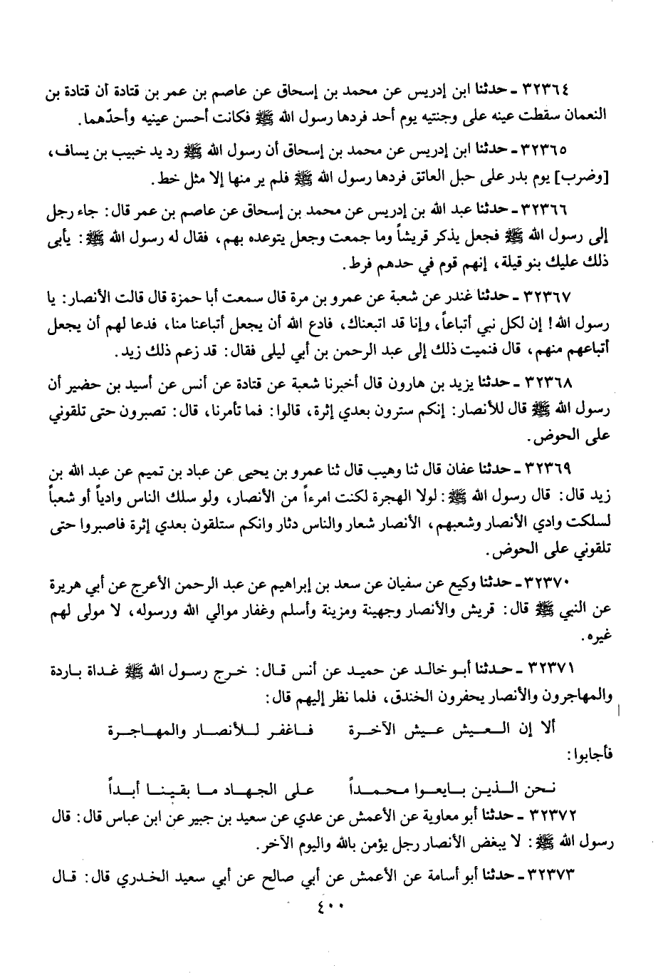 32372 - حَدَّثَنَا أَبُو مُعَاوِيَةَ، عَنِ الْأَعْمَشِ، عَنْ عَدِيٍّ، عَنْ سَعِيدِ بْنِ جُبَيْرٍ، عَنِ ابْنِ عَبَّاسٍ، قَالَ: قَالَ رَسُولُ اللَّهِ صَلَّى اللهُ عَلَيْهِ وَسَلَّمَ: «§لَا يُبْغِضُ الْأَنْصَارَ رَجُلٌ يُؤْمِنُ بِاللَّهِ وَالْيَوْمِ الْآخِرِ»