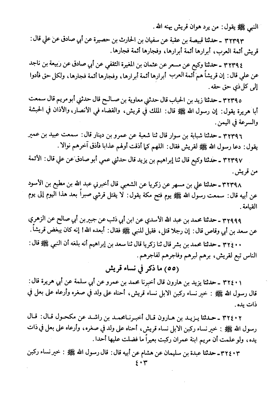 32400 - حَدَّثَنَا مُحَمَّدُ بْنُ بِشْرٍ، قَالَ: ثنا زَكَرِيَّا، قَالَ: ثنا سَعْدُ بْنُ إِبْرَاهِيمَ، أَنَّهُ بَلَغَهُ أَنَّ النَّبِيَّ صَلَّى اللهُ عَلَيْهِ وَسَلَّمَ قَالَ: «§النَّاسُ تَبَعٌ لِقُرَيْشٍ، بَرُّهُمْ لِبَرِّهِمْ وَفَاجِرُهُمْ لِفَاجِرِهِمْ»