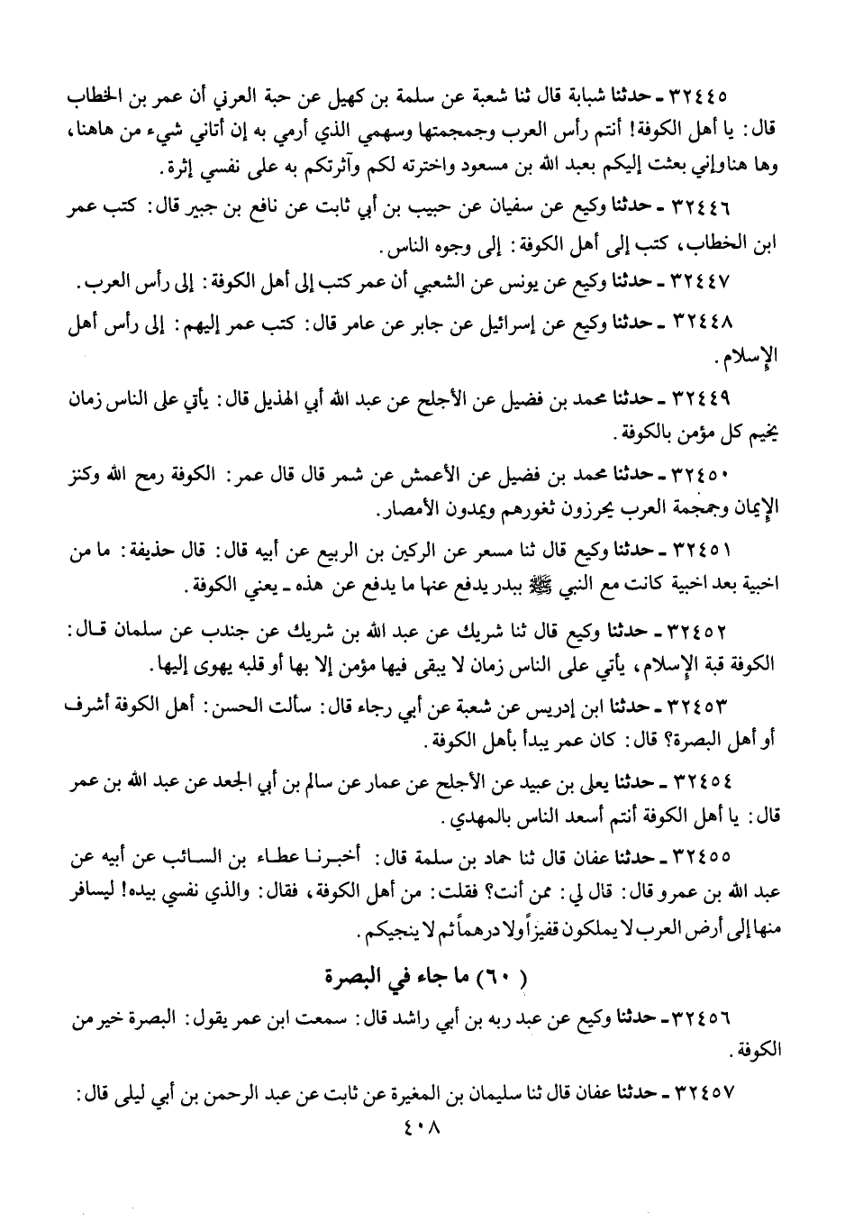 32456 - حَدَّثَنَا وَكِيعٌ، عَنْ عَبْدِ رَبِّهِ بْنِ أَبِي رَاشِدٍ، قَالَ: سَمِعْتُ ابْنَ عُمَرَ، يَقُولُ: «§الْبَصْرَةُ خَيْرٌ مِنَ الْكُوفَةِ»
