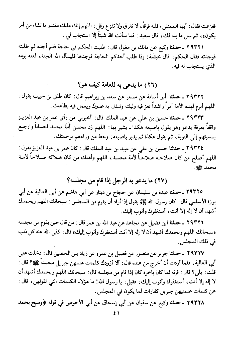 29325 - حَدَّثَنَا عَبْدَةُ بْنُ سُلَيْمَانَ، عَنْ حَجَّاجِ بْنِ دِينَارٍ، عَنْ أَبِي هَاشِمٍ، عَنْ أَبِي الْعَالِيَةِ، عَنْ أَبِي بَرْزَةَ الْأَسْلَمِيِّ، قَالَ: كَانَ رَسُولُ اللَّهِ صَلَّى اللهُ عَلَيْهِ وَسَلَّمَ، يَقُولُ §إِذَا أَرَادَ أَنْ يَقُومَ مِنَ الْمَجْلِسِ: «سُبْحَانَكَ اللَّهُمَّ وَبِحَمْدِكَ أَشْهَدُ أَنْ لَا إِلَهَ إِلَّا أَنْتَ، أَسْتَغْفِرُكَ وَأَتُوبُ إِلَيْكَ»