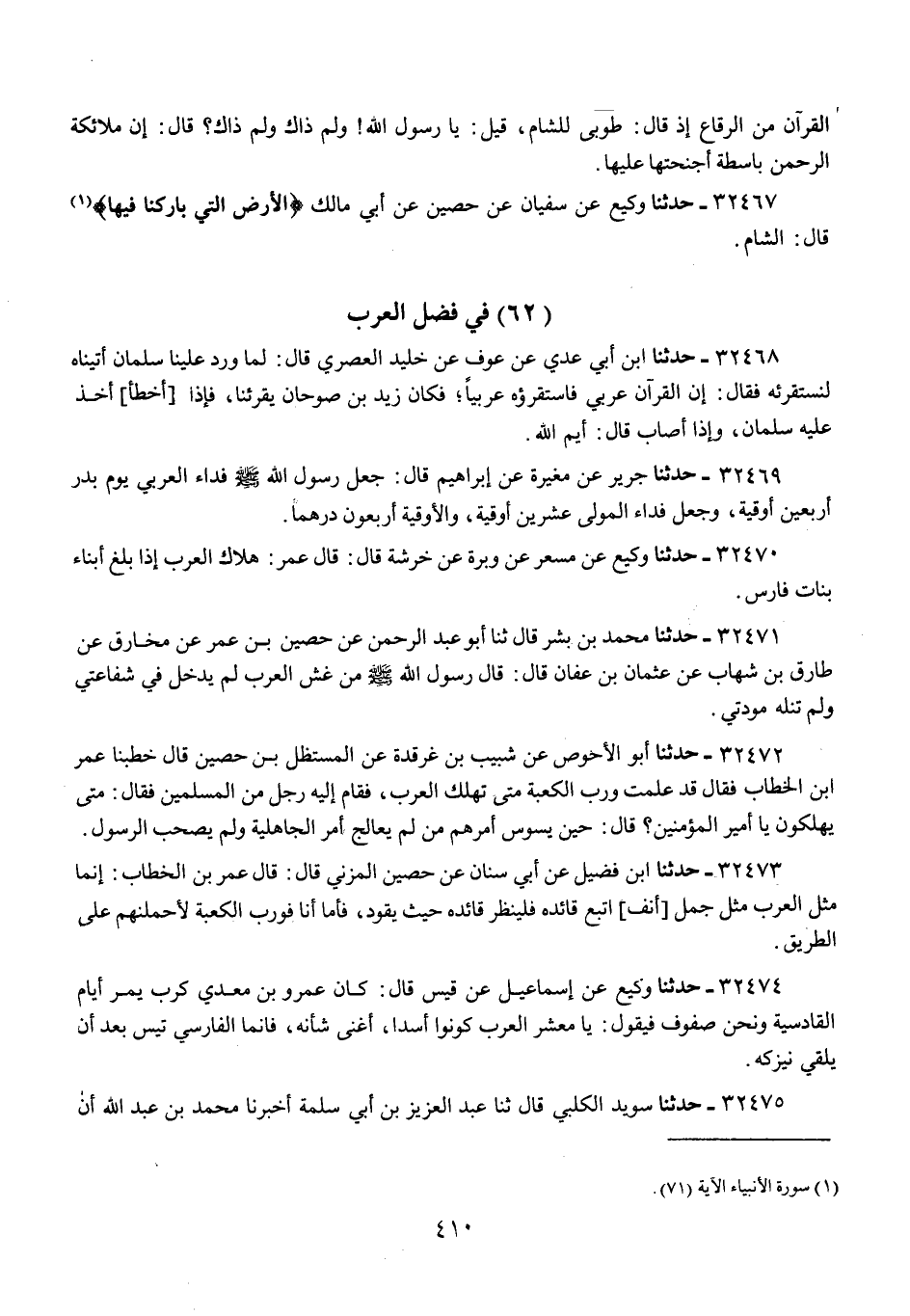 32467 - حَدَّثَنَا وَكِيعٌ، عَنْ سُفْيَانَ، عَنْ حُصَيْنٍ، عَنْ أَبِي مَالِكٍ، " {§الْأَرْضِ الَّتِي بَارَكْنَا فِيهَا} [الأنبياء: 71] قَالَ: الشَّامُ "