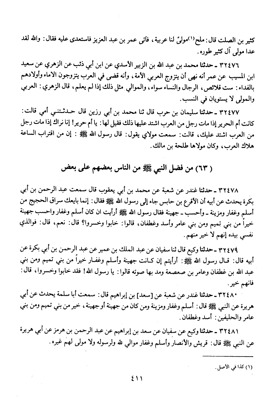 32480 - حَدَّثَنَا غُنْدَرٌ، عَنْ شُعْبَةَ، عَنْ سَعْدِ بْنِ إِبْرَاهِيمَ، قَالَ: سَمِعْتُ أَبَا سَلَمَةَ، يُحَدِّثُ، عَنْ أَبِي هُرَيْرَةَ، عَنِ النَّبِيِّ صَلَّى اللهُ عَلَيْهِ وَسَلَّمَ قَالَ: " §أَسْلَمُ وَغِفَارٌ وَمُزَيْنَةُ وَمَنْ كَانَ مِنْ جُهَيْنَةَ أَوْ جُهَيْنَةُ، خَيْرٌ مِنْ بَنِي تَمِيمٍ وَمِنْ بَنِي عَامِرٍ وَالْحَلِيفَيْنِ: أَسَدٍ وَغَطَفَانَ "