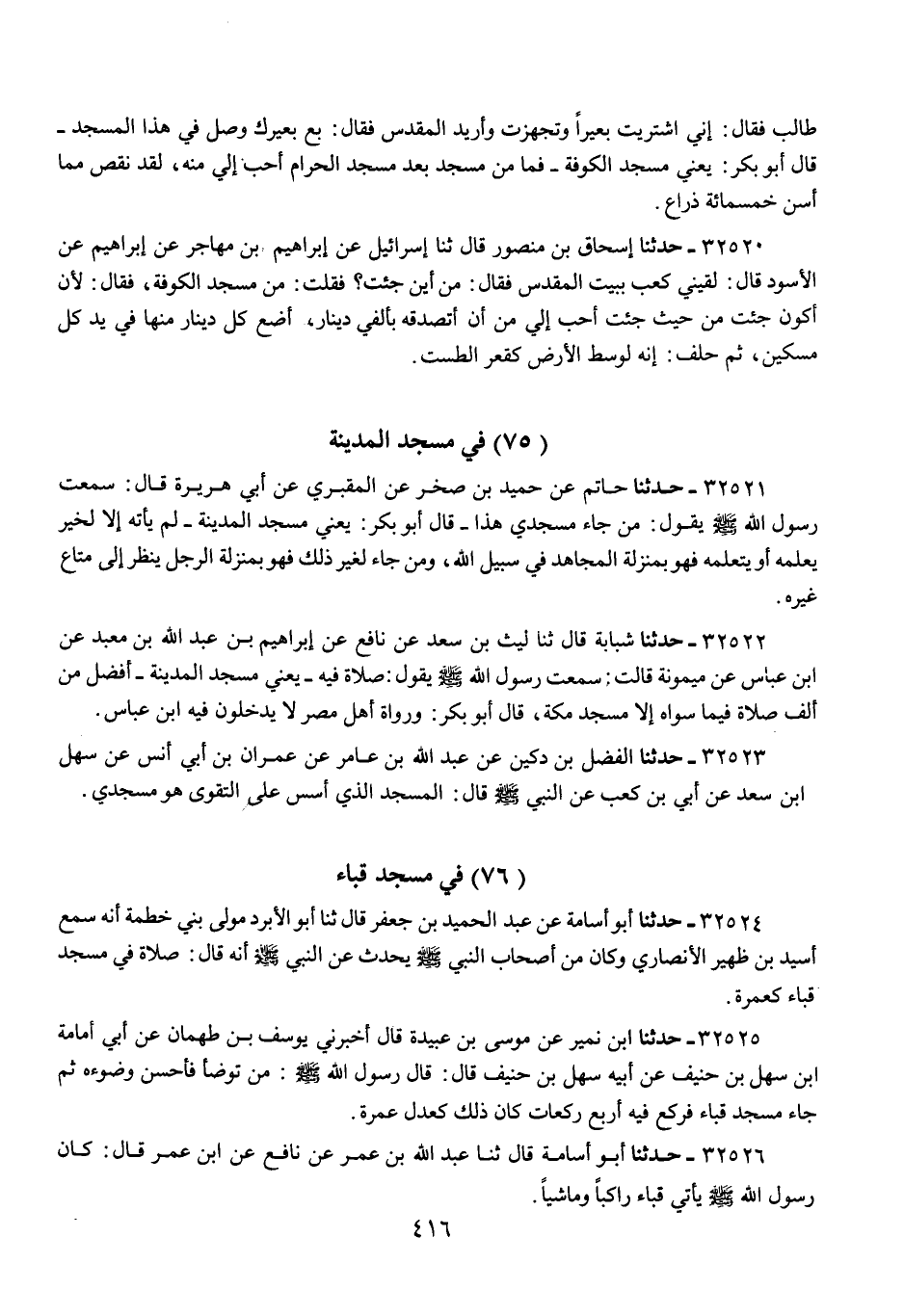 32526 - حَدَّثَنَا أَبُو أُسَامَةَ، قَالَ: ثنا عَبْدُ اللَّهِ بْنُ عُمَرَ، عَنْ نَافِعٍ، عَنِ ابْنِ عُمَرَ، قَالَ: «كَانَ رَسُولُ اللَّهِ صَلَّى اللهُ عَلَيْهِ وَسَلَّمَ §يَأْتِي قُبَاءَ رَاكِبًا وَمَاشِيًا»