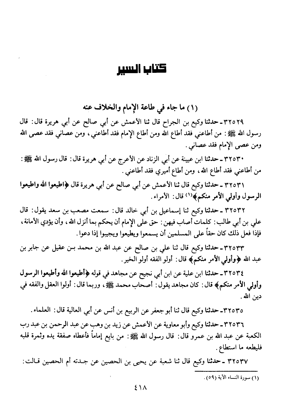 32531 - حَدَّثَنَا وَكِيعٌ، قَالَ ثنا الْأَعْمَشُ، عَنْ أَبِي صَالِحٍ، عَنْ أَبِي هُرَيْرَةَ، قَالَ: §أَطِيعُوا اللَّهَ وَأَطِيعُوا الرَّسُولَ وَأُولِي الْأَمْرِ مِنْكُمْ قَالَ: الْأُمَرَاءُ.