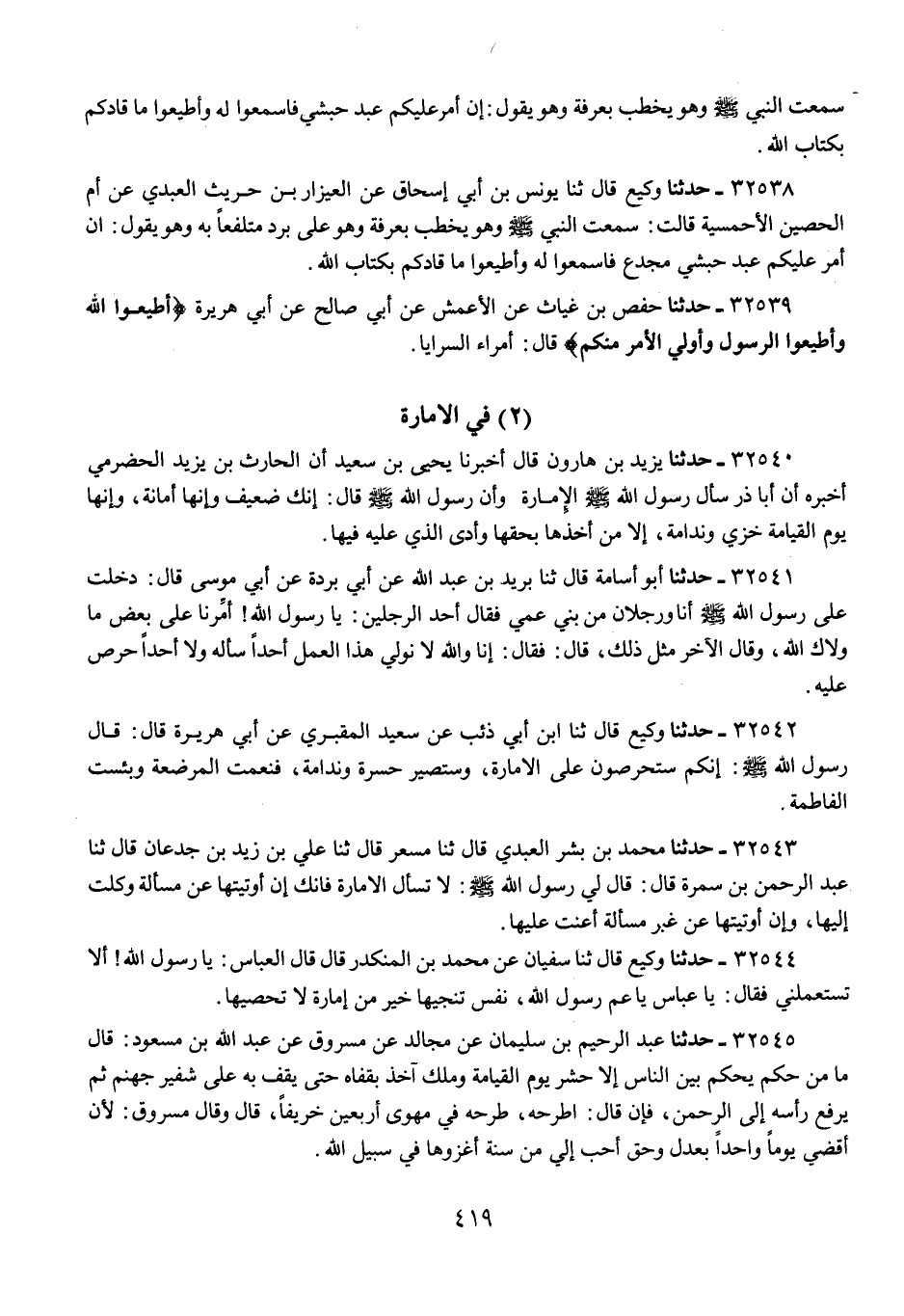 32544 - حَدَّثَنَا وَكِيعٌ، قَالَ ثنا سُفْيَانُ، عَنْ مُحَمَّدِ بْنِ الْمُنْكَدِرِ، قَالَ: قَالَ الْعَبَّاسُ يَا رَسُولَ اللَّهِ , أَلَا تَسْتَعْمِلُنِي؟ فَقَالَ: يَا عَبَّاسُ يَا عَمَّ رَسُولِ اللَّهِ صَلَّى اللهُ عَلَيْهِ وَسَلَّمَ ; §نَفْسٌ تُنَجِّيهَا خَيْرٌ مِنْ إِمَارَةٍ لَا تُحْصِيهَا