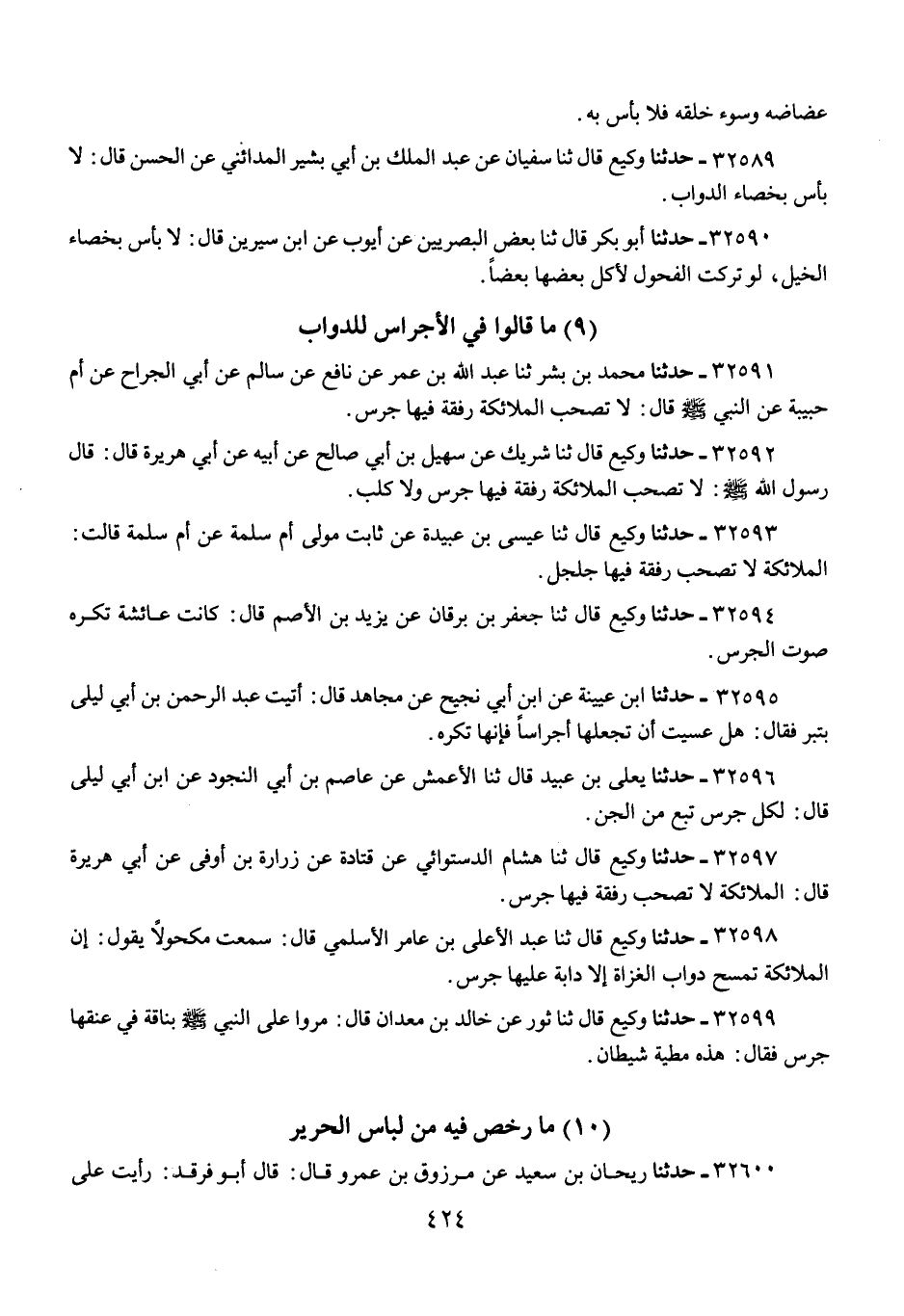 32597 - حَدَّثَنَا وَكِيعٌ، قَالَ ثنا هِشَامٌ الدَّسْتُوَائِيُّ، عَنْ قَتَادَةَ، عَنْ زُرَارَةَ بْنِ أَوْفَى، عَنْ أَبِي هُرَيْرَةَ، قَالَ: «§الْمَلَائِكَةُ لَا تَصْحَبُ رُفْقَةً فِيهَا جَرَسٌ».