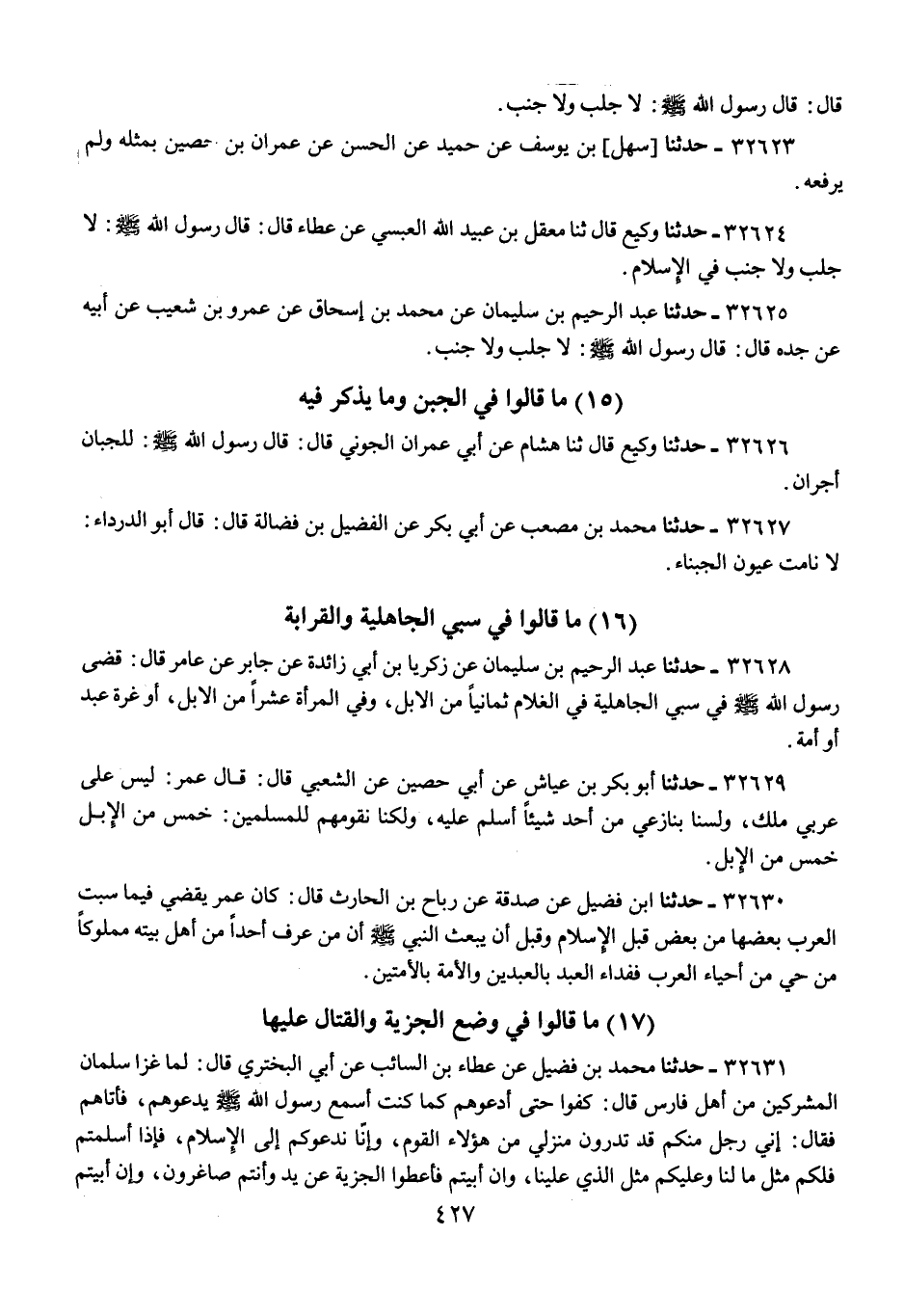 32628 - حَدَّثَنَا عَبْدُ الرَّحِيمِ بْنُ سُلَيْمَانَ عَنْ زَكَرِيَّا بْنِ أَبِي زَائِدَةَ عَنْ جَابِرٍ عَنْ عَامِرٍ قَالَ: «§قَضَى رَسُولُ اللَّهِ صَلَّى اللهُ عَلَيْهِ وَسَلَّمَ فِي سَبْيِ الْجَاهِلِيَّةِ فِي الْغُلَامِ ثَمَانِيًا مِنَ الْإِبِلِ , وَفِي الْمَرْأَةِ عَشْرًا مِنَ الْإِبِلِ , أَوْ غُرَّةَ عَبْدٍ أَوْ أَمَةٍ»