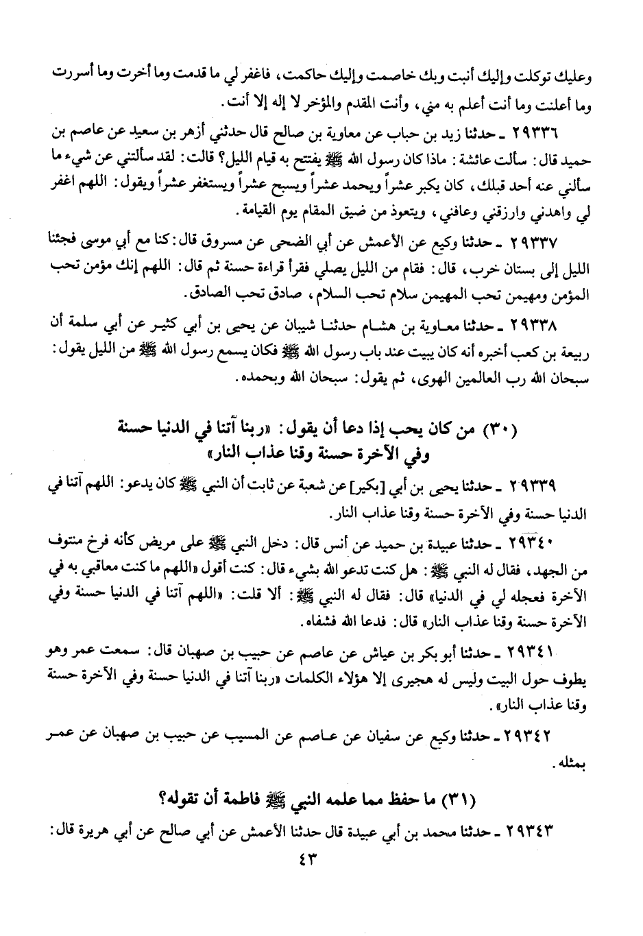29341 - حَدَّثَنَا أَبُو بَكْرِ بْنُ عَيَّاشٍ، عَنْ عَاصِمٍ، عَنْ حَبِيبِ بْنِ صَهْبَانَ، قَالَ: سَمِعْتُ عُمَرَ وَهُوَ §يَطُوفُ حَوْلَ الْبَيْتِ وَلَيْسَ لَهُ هِجِّيرَى إِلَّا هَؤُلَاءِ الْكَلِمَاتِ: " {رَبَّنَا آتِنَا فِي الدُّنْيَا حَسَنَةً وَفِي الْآخِرَةِ حَسَنَةً وَقِنَا} [البقرة: 201] عَذَابَ النَّارِ "،