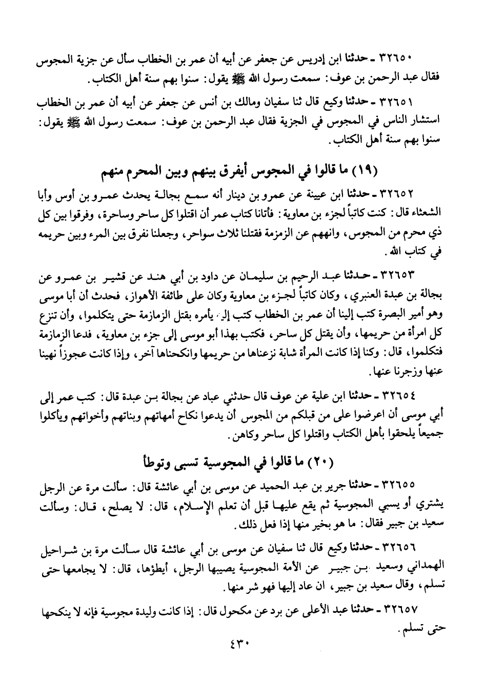 32650 - حَدَّثَنَا ابْنُ إِدْرِيسَ، عَنْ جَعْفَرٍ، عَنْ أَبِيهِ، أَنَّ عُمَرَ بْنَ الْخَطَّابِ، سَأَلَ عَنْ جِزْيَةِ الْمَجُوسِ، فَقَالَ عَبْدُ الرَّحْمَنِ بْنُ عَوْفٍ: سَمِعْتُ رَسُولَ اللَّهِ صَلَّى اللهُ عَلَيْهِ وَسَلَّمَ يَقُولُ: §سُنُّوا بِهِمْ سُنَّةَ أَهْلِ الْكِتَابِ.