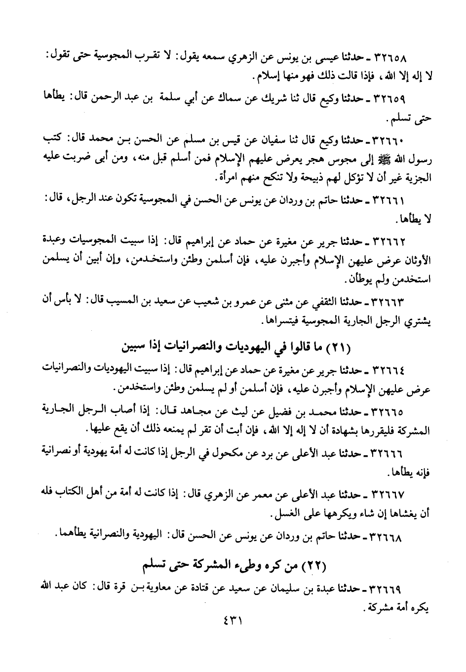 32660 - حَدَّثَنَا وَكِيعٌ، قَالَ ثنا سُفْيَانُ، عَنْ قَيْسِ بْنِ مُسْلِمٍ، عَنِ الْحَسَنِ بْنِ مُحَمَّدٍ، قَالَ: كَتَبَ رَسُولُ اللَّهِ صَلَّى اللهُ عَلَيْهِ وَسَلَّمَ إِلَى مَجُوسِ هَجَرَ §يَعْرِضُ عَلَيْهِمِ الْإِسْلَامَ فَمَنْ أَسْلَمَ قَبِلَ مِنْهُ , وَمَنْ أَبَى ضُرِبَتْ عَلَيْهِ الْجِزْيَةُ غَيْرَ أَنْ لَا تُؤْكَلَ لَهُمْ ذَبِيحَةٌ وَلَا تُنْكَحَ مِنْهُمُ امْرَأَةٌ "