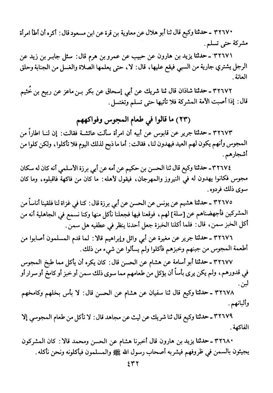 32670 - حَدَّثَنَا وَكِيعٌ، قَالَ ثنا أَبُو هِلَالٍ، عَنْ مُعَاوِيَةَ بْنِ قُرَّةَ، عَنِ ابْنِ مَسْعُودٍ، قَالَ: §أَكْرَهُ أَنْ أَطَأَ، امْرَأَةً مُشْرِكَةً حَتَّى تُسْلِمَ "