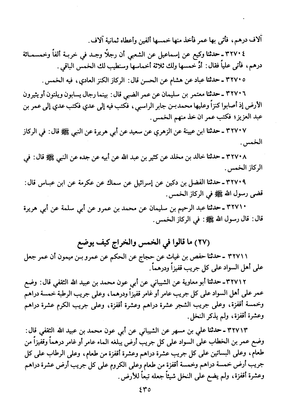 32706 - حَدَّثَنَا مُعْتَمِرٌ، عَنْ سُلَيْمَانَ، عَنْ عُمَرَ الضَّبِّيِّ، قَالَ: «§بَيْنَمَا رِجَالٌ يُسَابُّونَ وَيَلُتُّونَ أَوْ يُثِيرُونَ الْأَرْضَ إِذْ أَصَابُوا كَنْزًا» وَعَلَيْهَا مُحَمَّدُ بْنُ جَابِرٍ الرَّاسِبِيُّ، فَكَتَبَ فِيهِ إِلَى عَدِيٍّ فَكَتَبَ عَدِيٌّ إِلَى عُمَرَ بْنِ عَبْدِ الْعَزِيزِ، فَكَتَبَ عُمَرُ أَنْ خُذْ مِنْهُمُ الْخُمُسَ