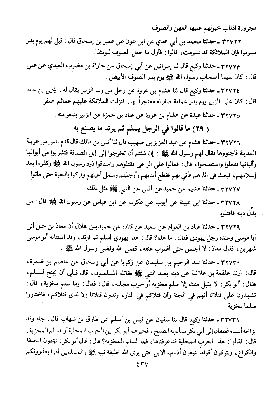 32729 - حَدَّثَنَا عَبَّادُ بْنُ الْعَوَّامِ، عَنْ سَعِيدٍ، عَنْ قَتَادَةَ، عَنْ حُمَيْدِ بْنِ هِلَالٍ، أَنَّ مُعَاذَ بْنَ جَبَلٍ، أَتَى أَبَا مُوسَى وَعِنْدَهُ رَجُلٌ يَهُودِيٌّ، فَقَالَ: مَا هَذَا؟ قَالَ: هَذَا يَهُودِيٌّ أَسْلَمَ ثُمَّ ارْتَدَّ، وَقَدِ اسْتَتَابَهُ أَبُو مُوسَى شَهْرَيْنِ، فَقَالَ مُعَاذٌ: «§لَا أَجْلِسُ حَتَّى أَضْرِبَ عُنُقَهُ، قَضَى اللَّهُ وَقَضَى رَسُولُ اللَّهِ صَلَّى اللهُ عَلَيْهِ وَسَلَّمَ»