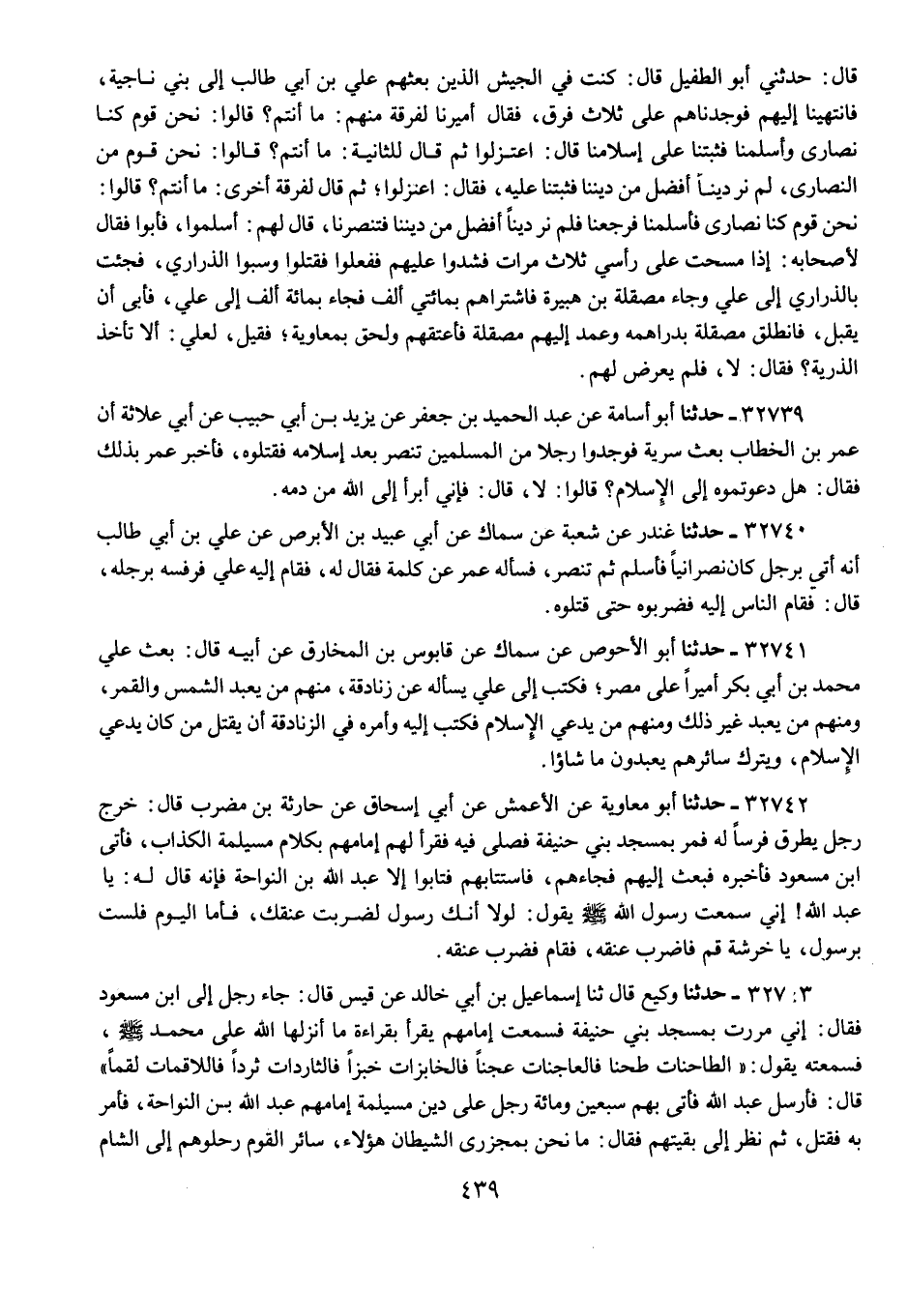 32742 - حَدَّثَنَا أَبُو مُعَاوِيَةَ، عَنِ الْأَعْمَشِ، عَنْ أَبِي إِسْحَاقَ، عَنْ حَارِثَةَ بْنِ مُضَرِّبٍ، قَالَ: " §خَرَجَ رَجُلٌ يَطْرُقُ فَرَسًا لَهُ فَمَرَّ بِمَسْجِدِ بَنِي حَنِيفَةَ فَصَلَّى فِيهِ فَقَرَأَ لَهُمْ إِمَامُهُمْ بِكَلَامِ مُسَيْلِمَةَ الْكَذَّابِ، فَأَتَى ابْنُ مَسْعُودٍ فَأَخْبَرَهُ فَبَعَثَ إِلَيْهِمْ فَجَاءَهُمْ، فَاسْتَتَابَهُمْ فَتَابُوا إِلَّا عَبْدَ اللَّهِ ابْنَ النَّوَّاحَةِ، فَإِنَّهُ قَالَ لَهُ: يَا عَبْدَ اللَّهِ، إِنِّي سَمِعْتُ رَسُولَ اللَّهِ صَلَّى اللهُ عَلَيْهِ وَسَلَّمَ يَقُولُ: «لَوْلَا أَنَّكَ رَسُولٌ لَضَرَبْتُ عُنُقَكَ، فَأَمَّا الْيَوْمَ فَلَسْتُ بِرَسُولٍ، يَا خَرَشَةُ قُمْ فَاضْرِبْ عُنُقَهُ»، فَقَامَ فَضَرَبَ عُنُقَهُ "