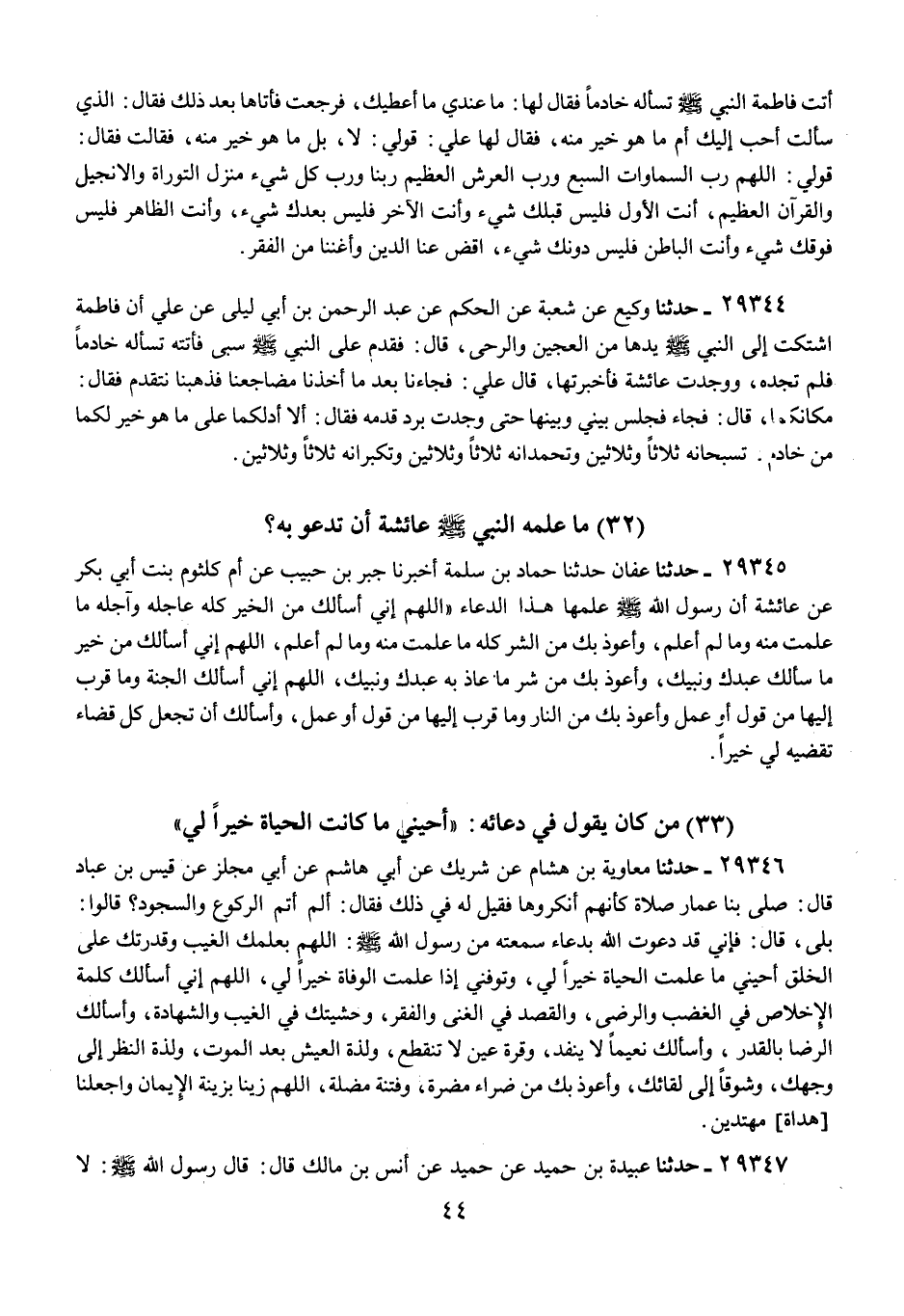 29344 - حَدَّثَنَا وَكِيعٌ، عَنْ شُعْبَةَ، عَنِ الْحَكَمِ، عَنْ عَبْدِ الرَّحْمَنِ بْنِ أَبِي لَيْلَى، عَنْ عَلِيٍّ، أَنَّ فَاطِمَةَ اشْتَكَتْ إِلَى النَّبِيِّ صَلَّى اللهُ عَلَيْهِ وَسَلَّمَ يَدَهَا مِنَ الْعَجِينِ وَالرَّحَى، قَالَ: فَقَدِمَ عَلَى النَّبِيِّ صَلَّى اللهُ عَلَيْهِ وَسَلَّمَ سَبْيٌ، فَأَتَتْهُ تَسْأَلُهُ خَادِمًا، فَلَمْ تَجِدْهُ وَوَجَدَتْ عَائِشَةَ فَأَخْبَرَتْهَا، قَالَ عَلِيٌّ: فَجَاءَنَا بَعْدَمَا أَخَذْنَا مَضَاجِعَنَا، فَذَهَبْنَا نَتَقَدَّمُ، فَقَالَ: «مَكَانَكُمَا»، قَالَ: فَجَاءَ فَجَلَسَ بَيْنِي وَبَيْنَهَا حَتَّى وَجَدْتُ بَرْدَ قَدَمِهِ، فَقَالَ: «§أَلَا أَدُلُّكُمَا عَلَى مَا هُوَ خَيْرٌ لَكُمَا مِنْ خَادِمٍ تُسَبِّحَانِهِ ثَلَاثًا وَثَلَاثِينَ، وَتَحْمَدَانِهِ ثَلَاثًا وَثَلَاثِينَ، وَتُكَبِّرَانِهِ ثَلَاثًا وَثَلَاثِينَ»