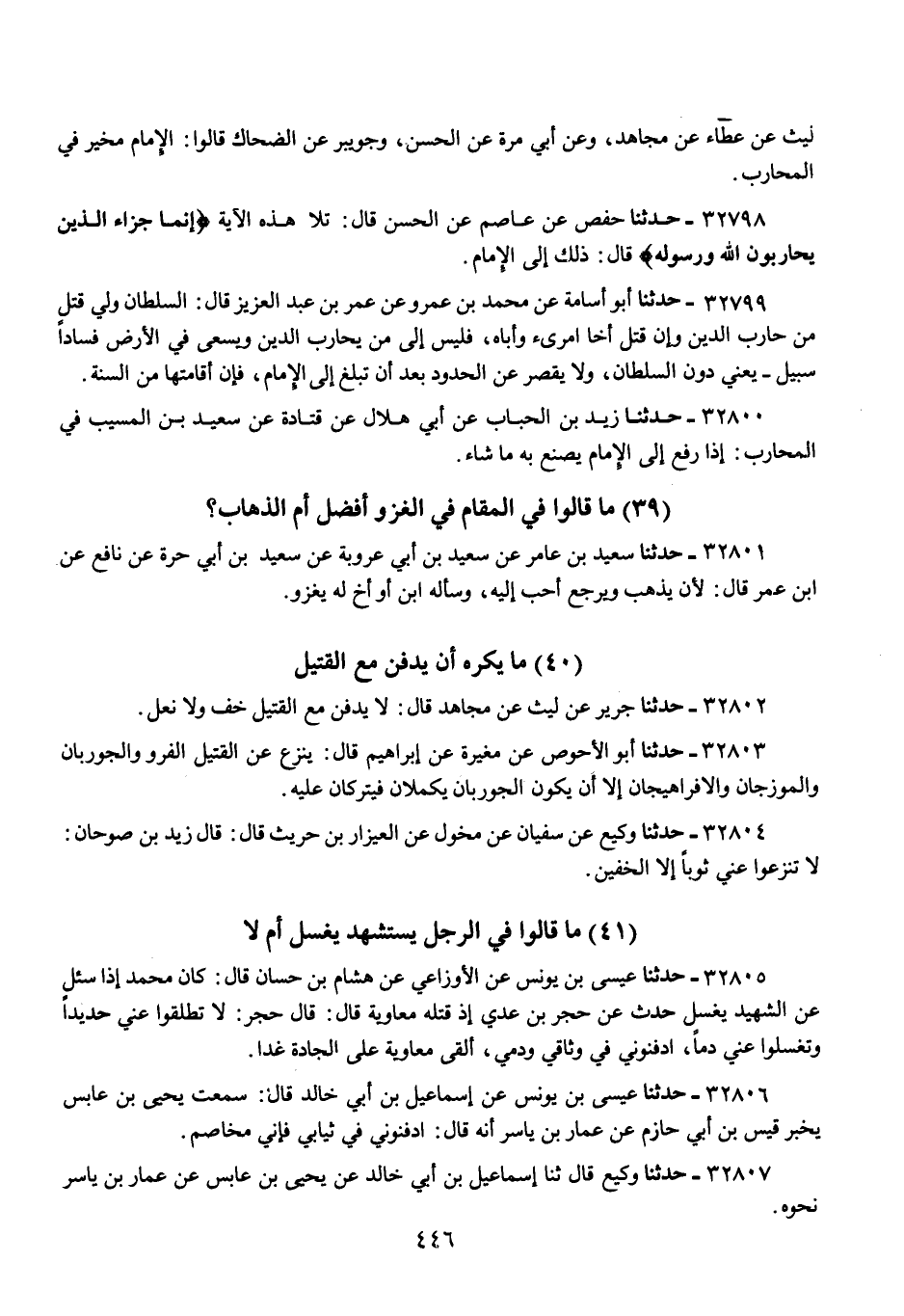 32803 - حَدَّثَنَا أَبُو الْأَحْوَصِ، عَنْ مُغِيرَةَ، عَنْ إِبْرَاهِيمَ، قَالَ: «§يُنْزَعُ عَنِ الْقَتِيلِ الْفَرْوُ وَالْجَوْرَبَانِ، وَالْمَوْزَجَانُ، وَالْأَفْرَاهَيْجَانُ، إِلَّا أَنْ يَكُونَ الْجَوْرَبَانِ يُكَمِّلَانِ فَيُتْرَكَانِ عَلَيْهِ»