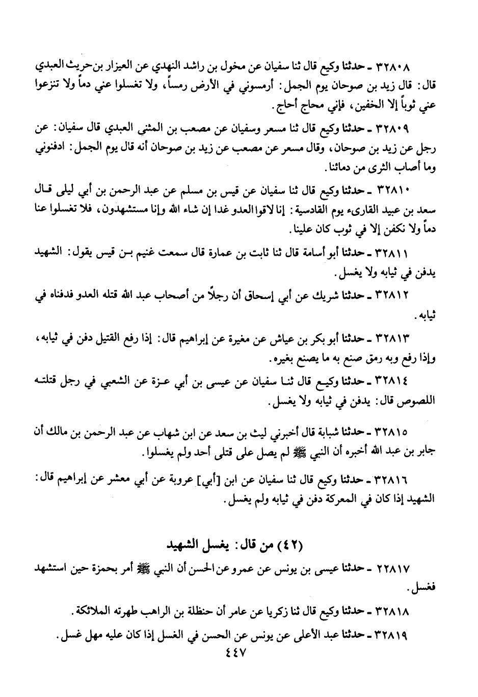 32816 - حَدَّثَنَا وَكِيعٌ، قَالَ: ثنا سُفْيَانُ، عَنِ ابْنِ أَبِي عَرُوبَةَ، عَنْ أَبِي مَعْشَرٍ، عَنْ إِبْرَاهِيمَ، قَالَ: «§الشَّهِيدُ إِذَا كَانَ فِي الْمَعْرَكَةِ دُفِنَ فِي ثِيَابِهِ وَلَمْ يُغَسَّلْ»