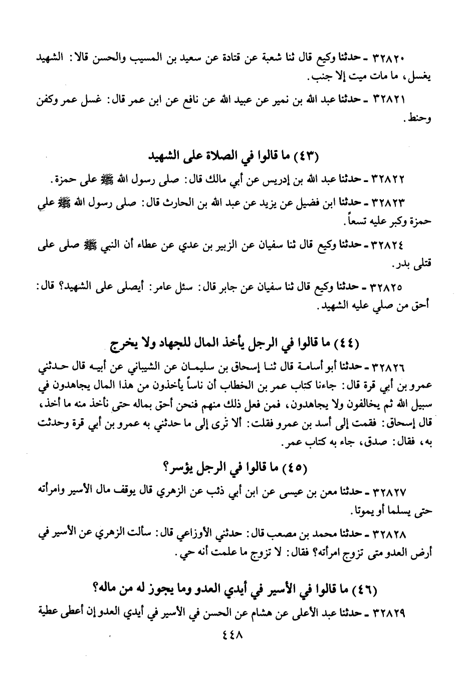 32824 - حَدَّثَنَا وَكِيعٌ، قَالَ: ثنا سُفْيَانُ، عَنِ الزُّبَيْرِ بْنِ عَدِيٍّ، عَنْ عَطَاءٍ، «أَنَّ النَّبِيَّ صَلَّى اللهُ عَلَيْهِ وَسَلَّمَ، §صَلَّى عَلَى قَتْلَى بَدْرٍ»