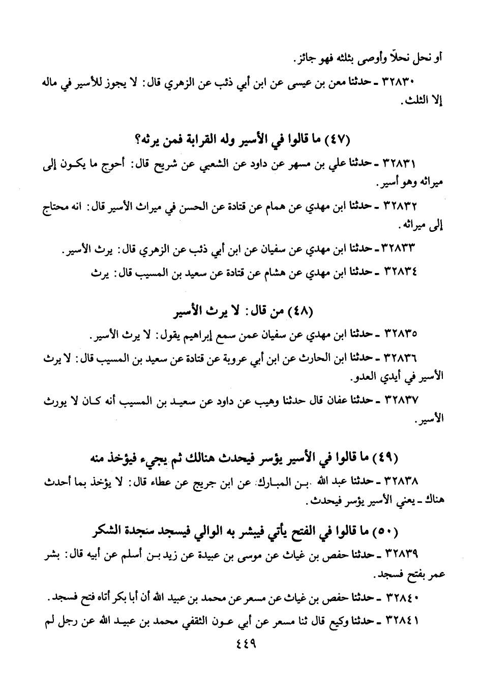 32833 - حَدَّثَنَا ابْنُ مَهْدِيٍّ، عَنْ سُفْيَانَ، عَنِ ابْنِ أَبِي ذِئْبٍ، عَنِ الزُّهْرِيِّ، قَالَ: «§يَرِثُ الْأَسِيرُ»