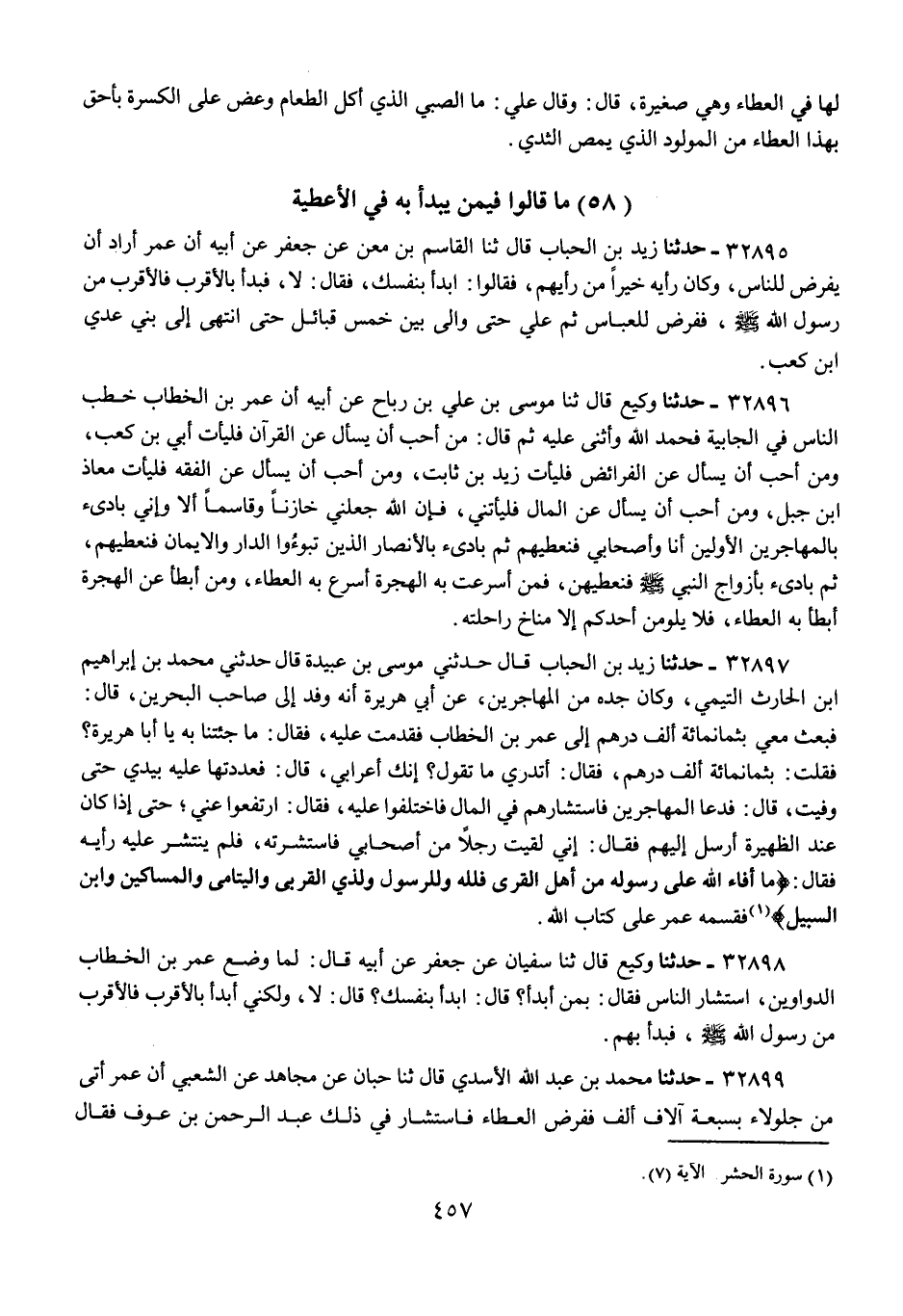 32899 - حَدَّثَنَا مُحَمَّدُ بْنُ عَبْدِ اللَّهِ الْأَسَدِيُّ، قَالَ: ثنا حِبَّانُ، عَنْ مُجَالِدٍ، عَنِ الشَّعْبِيِّ، أَنَّ عُمَرَ، أُتِيَ مِنْ جَلُولَاءَ بِسَبْعَةِ آلَافِ أَلْفٍ فَفَرَضَ الْعَطَاءَ فَاسْتَشَارَ فِي ذَلِكَ فَقَالَ عَبْدُ الرَّحْمَنِ بْنُ عَوْفٍ: «ابْدَأْ بِنَفْسِكَ، فَأَنْتَ أَحَقُّ بِذَلِكَ»، قَالَ: لَا، §بَلْ أَبْدَأُ بِالْأَقْرَبِ مِنْ رَسُولِ اللَّهِ صَلَّى اللهُ عَلَيْهِ وَسَلَّمَ، مِمَّنْ شَهِدَ بَدْرًا حَتَّى يَنْتَهِيَ ذَلِكَ إِلَيَّ، قَالَ: فَبَدَأَ فَفَرَضَ لِعَلِيٍّ فِي خَمْسَةِ آلَافٍ، ثُمَّ لِبَنِي هَاشِمٍ مِمَّنْ شَهِدَ بَدْرًا، ثُمَّ لِمَوَالِيهِمْ، ثُمَّ لِحُلَفَائِهِمْ ثُمَّ الْأَقْرَبِ فَالْأَقْرَبِ حَتَّى يَنْتَهِي ذَلِكَ إِلَيَّ