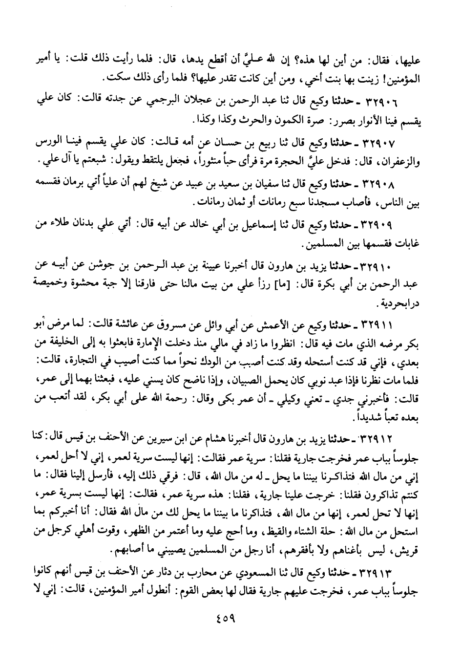 32913 - حَدَّثَنَا وَكِيعٌ قَالَ: ثنا الْمَسْعُودِيُّ، عَنْ مُحَارِبِ بْنِ دِثَارٍ، عَنِ الْأَحْنَفِ بْنِ قَيْسٍ، أَنَّهُمْ كَانُوا جُلُوسًا بِبَابِ عُمَرَ، فَخَرَجَتْ عَلَيْهِمْ جَارِيَةٌ فَقَالَ لَهَا بَعْضُ الْقَوْمِ: أَنَطُولُ أَمِيرَ الْمُؤْمِنِينَ قَالَتْ: إِنِّي لَا أَحِلُّ لَهُ، يَعْنِي أَنَّهَا مِنَ الْخُمُسِ، فَخَرَجَ عُمَرُ فَقَالَ: " §أَتَدْرُونَ مَا أَسْتَحِلُّ مِنْ هَذَا الْفَيْءِ؟ ظَهْرًا أَحُجُّ عَلَيْهِ وَأَعْتَمِرُ، وَحُلَّتَيْنِ: حُلَّةُ الشِّتَاءِ وَالصَّيْفِ، وَقُوتُ آلِ عُمَرَ قُوتُ أَهْلِ بَيْتِ رَجُلٍ مِنْ قُرَيْشٍ لَيْسُوا بِأَرْفَعِهِمْ وَلَا بِأَخَسِّهِمْ "