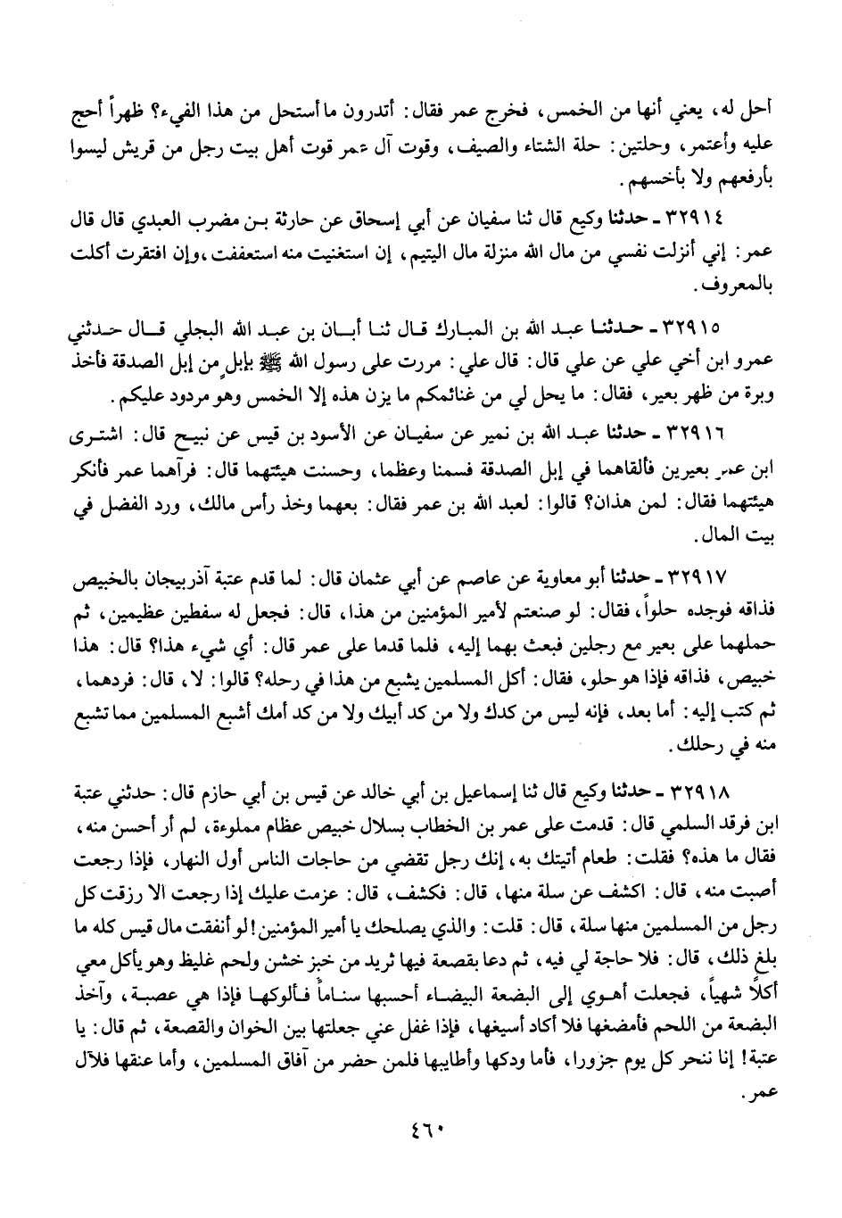 32914 - حَدَّثَنَا وَكِيعٌ قَالَ: ثنا سُفْيَانُ، عَنْ أَبِي إِسْحَاقَ، عَنْ حَارِثَةَ بْنِ مُضَرِّبٍ الْعَبْدِيِّ، قَالَ: قَالَ عُمَرُ: «§إِنِّي أَنْزَلَتْ نَفْسِي مِنْ مَالِ اللَّهِ مَنْزِلَةَ مَالِ الْيَتِيمِ، إِنِ اسْتَغْنَيْتَ مِنْهُ اسْتَعْفَفْتَ، وَإِنْ افْتَقَرْتَ أَكَلَتَ بِالْمَعْرُوفِ»