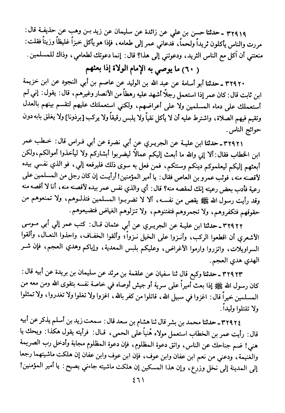 32921 - حَدَّثَنَا ابْنُ عُلَيَّةَ، عَنِ الْجُرَيْرِيِّ، عَنْ أَبِي نَضْرَةَ، عَنْ أَبِي فِرَاسٍ، قَالَ: خَطَبَ عُمَرُ بْنُ الْخَطَّابِ فَقَالَ: «أَلَا إِنِّي وَاللَّهِ مَا أَبْعَثُ إِلَيْكُمْ عُمَّالًا لِيَضْرِبُوا أَبْشَارَكُمْ وَلَا لِيَأْخُذُوا أَمْوَالَكُمْ، وَلَكِنْ أَبْعَثُهُمْ إِلَيْكُمْ لِيُعَلِّمُوكُمْ دِينَكُمْ وَسُنَّتَكُمْ، فَمَنْ فُعِلَ بِهِ سِوَى ذَلِكَ فَلْيَرْفَعْهُ إِلَيَّ، فَوَالَّذِي نَفْسِي بِيَدِهِ لَأُقِصَّنَّهُ مِنْهُ»، فَوَثَبَ عَمْرُو بْنُ الْعَاصِ فَقَالَ: يَا أَمِيرَ الْمُؤْمِنِينَ، أَرَأَيْتُكَ إِنْ كَانَ رَجُلٌ مِنَ الْمُسْلِمِينَ عَلَى رَعِيَّةٍ فَأَدَّبَ بَعْضَ رَعِيَّتِهِ إِنَّكَ لَمُقِصُّهُ مِنْهُ؟ قَالَ: أَيْ وَالَّذِي نَفْسُ عُمَرَ بِيَدِهِ لَأُقِصَّنَّهُ مِنْهُ، أَنَا لَا أُقِصُّهُ مِنْهُ وَقَدْ رَأَيْتُ رَسُولَ اللَّهِ صَلَّى اللهُ عَلَيْهِ وَسَلَّمَ، يُقِصُّ مِنْ نَفْسِهِ؟ «§أَلَا لَا تَضْرِبُوا الْمُسْلِمِينَ فَتُذِلُّوهُمْ، وَلَا تَمْنَعُوهُمْ مِنْ حُقُوقِهِمْ فَتُكَفِّرُوهُمْ، وَلَا تَجْمُرُوهُمْ فَتَفْتِنُوهُمْ، وَلَا تُنْزِلُوهُمُ الْغِيَاضَ فَتُضَيِّعُوهُمْ»