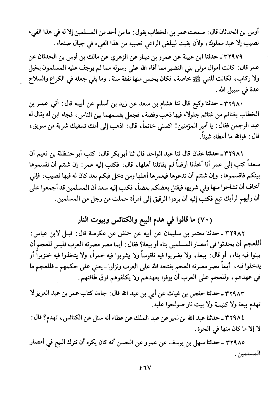 32984 - حَدَّثَنَا عَبْدُ اللَّهِ بْنُ نُمَيْرٍ، عَنْ عَبْدِ الْمَلِكِ، عَنْ عَطَاءٍ، أَنَّهُ سُئِلَ عَنِ الْكَنَائِسِ تُهْدَمُ؟ قَالَ: «§لَا إِلَّا مَا كَانَ مِنْهَا فِي الْحَرَّةِ»