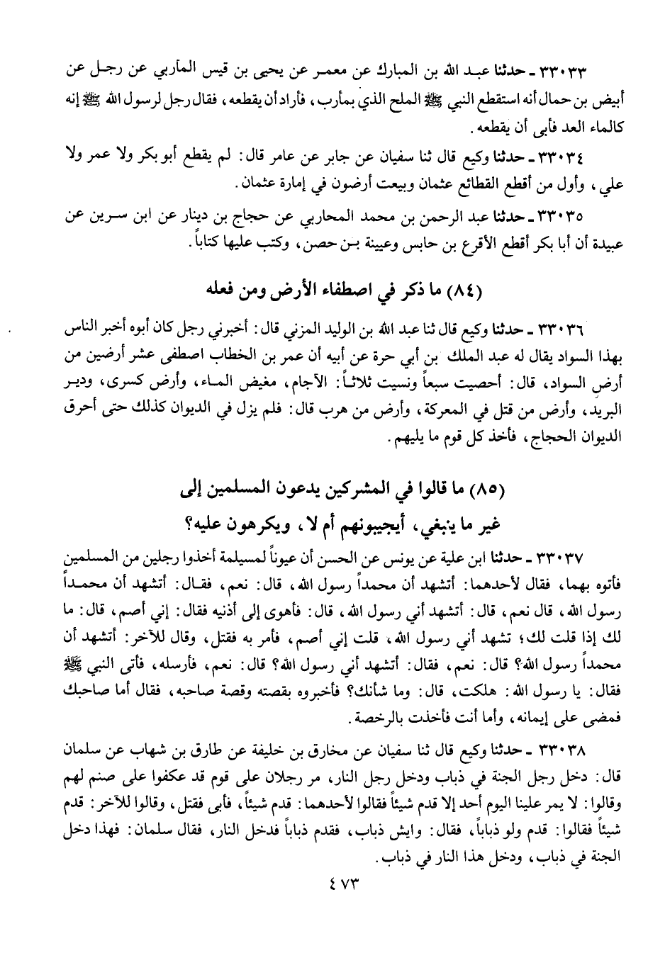 33034 - حَدَّثَنَا وَكِيعٌ، قَالَ: ثنا سُفْيَانُ، عَنْ جَابِرٍ، عَنْ عَامِرٍ، قَالَ: «§لَمْ يُقْطِعْ أَبُو بَكْرٍ وَلَا عُمَرُ وَلَا عَلِيٌّ، وَأَوَّلُ مَنْ أَقْطَعَ الْقَطَائِعَ عُثْمَانُ، وَبِيعَتْ أَرْضُونَ فِي إِمَارَةِ عُثْمَانَ»