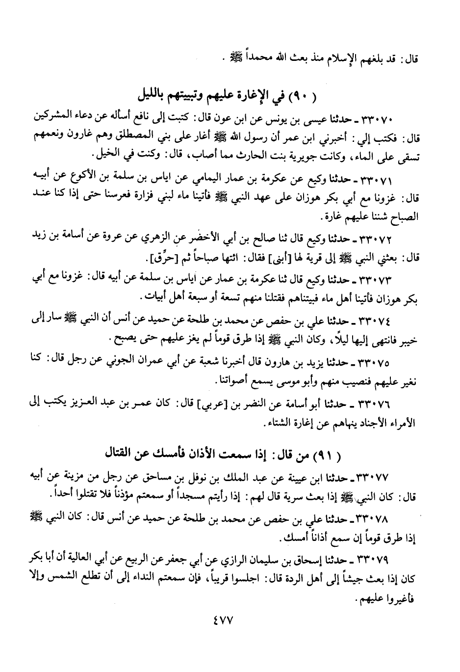33073 - حَدَّثَنَا وَكِيعٌ، قَالَ: ثنا عِكْرِمَةُ بْنُ عَمَّارٍ، عَنْ إِيَاسِ بْنِ سَلَمَةَ، عَنْ أَبِيهِ، قَالَ: «غَزَوْنَا مَعَ أَبِي بَكْرٍ هَوَازِنَ §فَأَتَيْنَا أَهْلَ مَاءٍ فَبَيَّتْنَاهُمْ فَقَتَلْنَا مِنْهُمْ تِسْعَةً أَوْ سَبْعَةً أَهْلَ أَبْيَاتٍ»