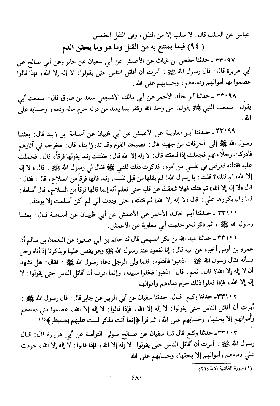 33103 - حَدَّثَنَا وَكِيعٌ، قَالَ: ثنا سُفْيَانُ، عَنْ صَالِحٍ، مَوْلَى التَّوْأَمَةِ عَنْ أَبِي هُرَيْرَةَ، قَالَ: قَالَ رَسُولُ اللَّهِ صَلَّى اللهُ عَلَيْهِ وَسَلَّمَ: " §أُمِرْتُ أَنْ أُقَاتِلَ النَّاسَ حَتَّى يَقُولُوا: لَا إِلَهَ إِلَّا اللَّهُ، فَإِذَا قَالُوا: لَا إِلَهَ إِلَّا اللَّهُ، حَرَّمْتُ عَلَيَّ دِمَاءَهُمْ وَأَمْوَالَهُمْ إِلَّا بِحَقِّهَا، وَحِسَابُهُمْ عَلَى اللَّهِ "