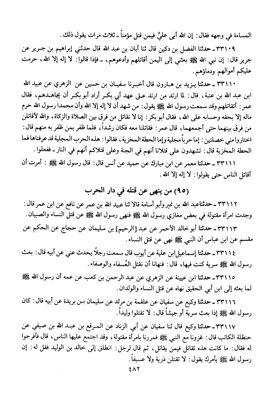 33117 - حَدَّثَنَا وَكِيعٌ، قَالَ: ثنا سُفْيَانُ، عَنْ أَبِي الزِّنَادِ، عَنِ الْمُرَقِّعِ بْنِ عَبْدِ اللَّهِ بْنِ صَيْفِيٍّ، عَنْ حَنْظَلَةَ الْكَاتِبِ، قَالَ: غَزَوْنَا مَعَ النَّبِيِّ صَلَّى اللهُ عَلَيْهِ وَسَلَّمَ، فَمَرَرْنَا بِامْرَأَةٍ مَقْتُولَةٍ، وَقَدِ اجْتَمَعَ عَلَيْهَا النَّاسُ، قَالَ فَأَفْرَجُوا لَهُ فَقَالَ: مَا كَانَتْ هَذِهِ تُقَاتِلُ فِيمَنْ يُقَاتِلُ، ثُمَّ قَالَ لِرَجُلٍ: انْطَلِقْ إِلَى خَالِدِ بْنِ الْوَلِيدِ فَقُلْ لَهُ: إِنَّ رَسُولَ اللَّهِ صَلَّى اللهُ عَلَيْهِ وَسَلَّمَ يَأْمُرُكَ يَقُولُ: «§لَا تَقْتُلَنَّ ذُرِّيَّةً وَلَا عَسِيفًا»