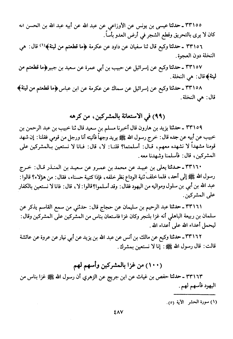 33162 - حَدَّثَنَا وَكِيعٌ، عَنْ مَالِكِ بْنِ أَنَسٍ، عَنْ عَبْدِ اللَّهِ بْنِ يَزِيدَ، عَنْ أَبِي نِيَارٍ، عَنْ عُرْوَةَ، عَنْ عَائِشَةَ قَالَتْ: قَالَ رَسُولُ اللَّهِ صَلَّى اللهُ عَلَيْهِ وَسَلَّمَ: «§إِنَّا لَا نَسْتَعِينُ بِمُشْرِكٍ»
