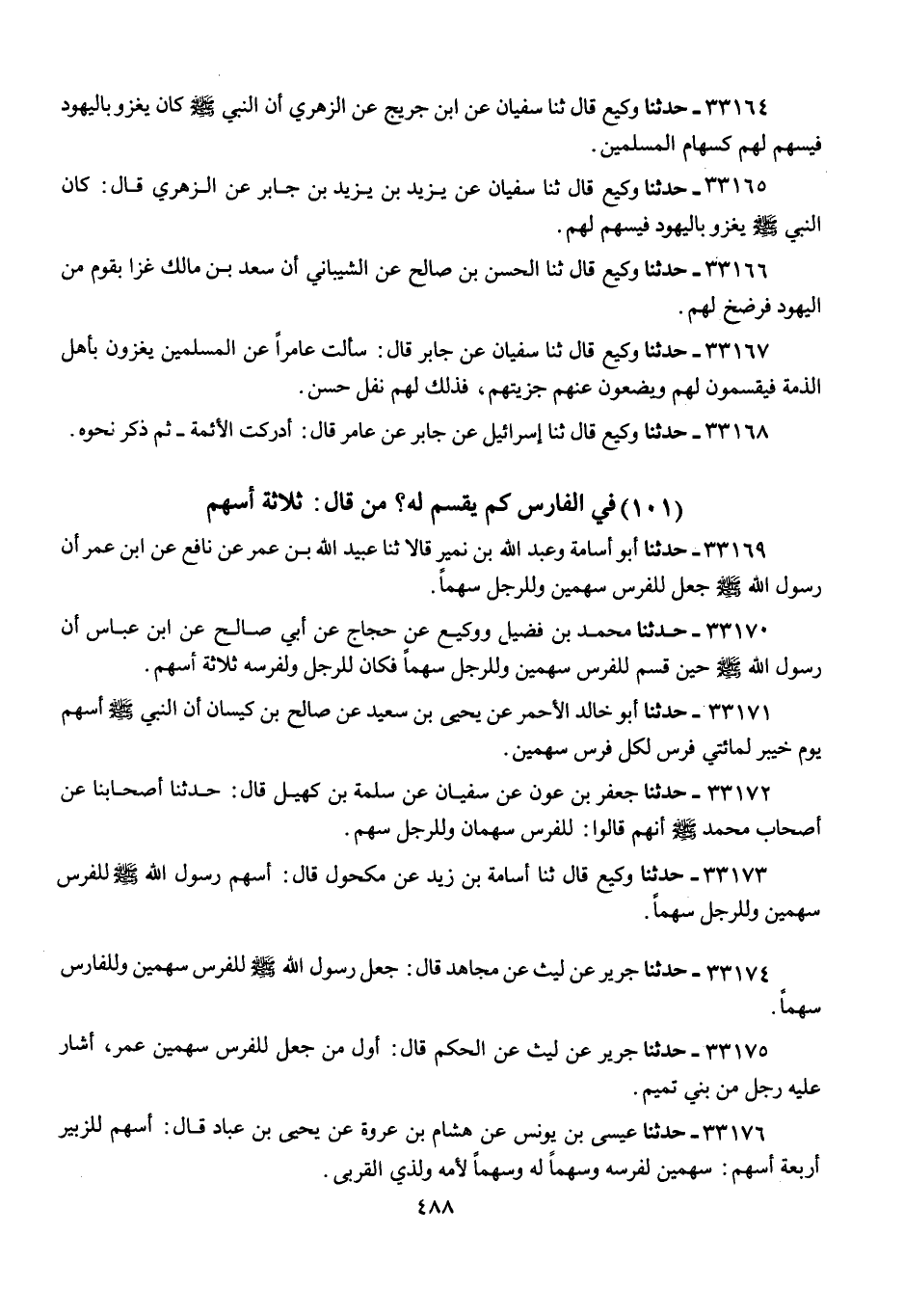 33164 - حَدَّثَنَا وَكِيعٌ قَالَ: ثنا سُفْيَانُ، عَنِ ابْنِ جُرَيْجٍ، عَنِ الزُّهْرِيِّ أَنَّ النَّبِيَّ صَلَّى اللهُ عَلَيْهِ وَسَلَّمَ كَانَ «§يَغْزُو بِالْيَهُودِ فَيُسْهِمُ لَهُمْ كَسِهَامِ الْمُسْلِمِينَ»