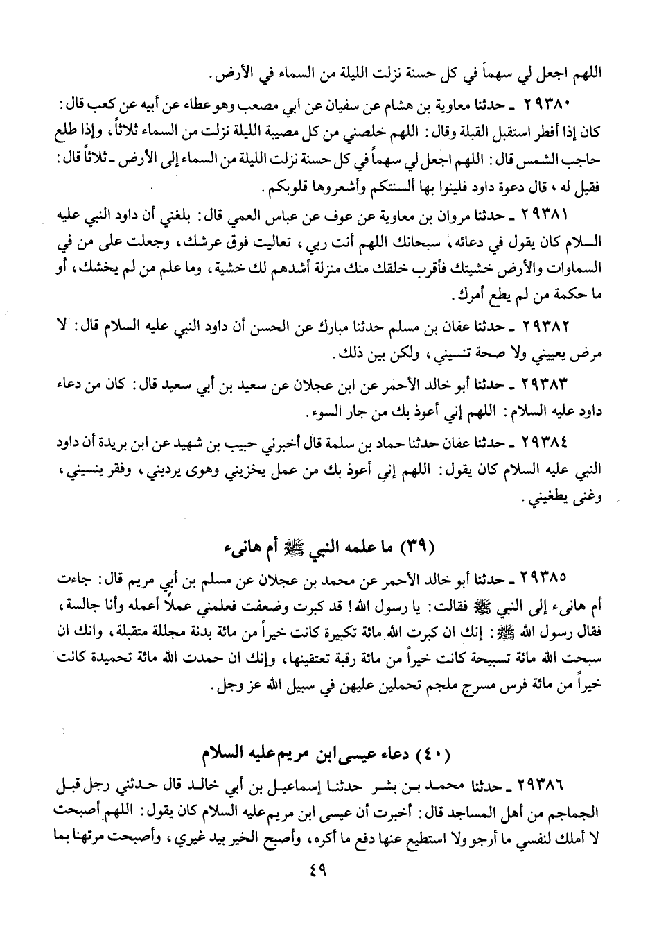 29386 - حَدَّثَنَا مُحَمَّدُ بْنُ بِشْرٍ، حَدَّثَنَا إِسْمَاعِيلُ بْنُ أَبِي خَالِدٍ، قَالَ: حَدَّثَنِي رَجُلٌ قَبْلَ الْجَمَاجِمِ مِنْ أَهْلِ الْمَسَاجِدِ، قَالَ: أُخْبِرْتُ أَنَّ §عِيسَى ابْنَ مَرْيَمَ عَلَيْهِ السَّلَامُ، كَانَ يَقُولُ: «اللَّهُمَّ أَصْبَحْتُ لَا أَمْلِكُ لِنَفْسِي مَا أَرْجُو، وَلَا أَسْتَطِيعُ عَنْهَا دَفْعَ مَا أَكْرَهُ، وَأَصْبَحَ الْخَيْرُ بِيَدِ غَيْرِي، وَأَصْبَحْتُ مُرْتَهَنًا بِمَا كَسَبْتُ، فَلَا فَقِيرَ أَفْقَرُ مِنِّي، فَلَا تَجْعَلْ مُصِيبَتِي فِي دِينِي، وَلَا تَجْعَلِ الدُّنْيَا أَكْبَرَ هَمِّي، وَلَا تُسَلِّطْ عَلَيَّ مَنْ لَا يَرْحَمُنِي»