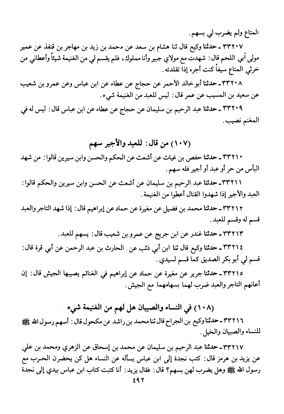 33209 - حَدَّثَنَا عَبْدُ الرَّحِيمِ بْنُ سُلَيْمَانَ، عَنْ حَجَّاجٍ، عَنْ عَطَاءٍ، عَنِ ابْنِ عَبَّاسٍ قَالَ: «§لَيْسَ لَهُ فِي الْمَغْنَمِ نَصِيبٌ»