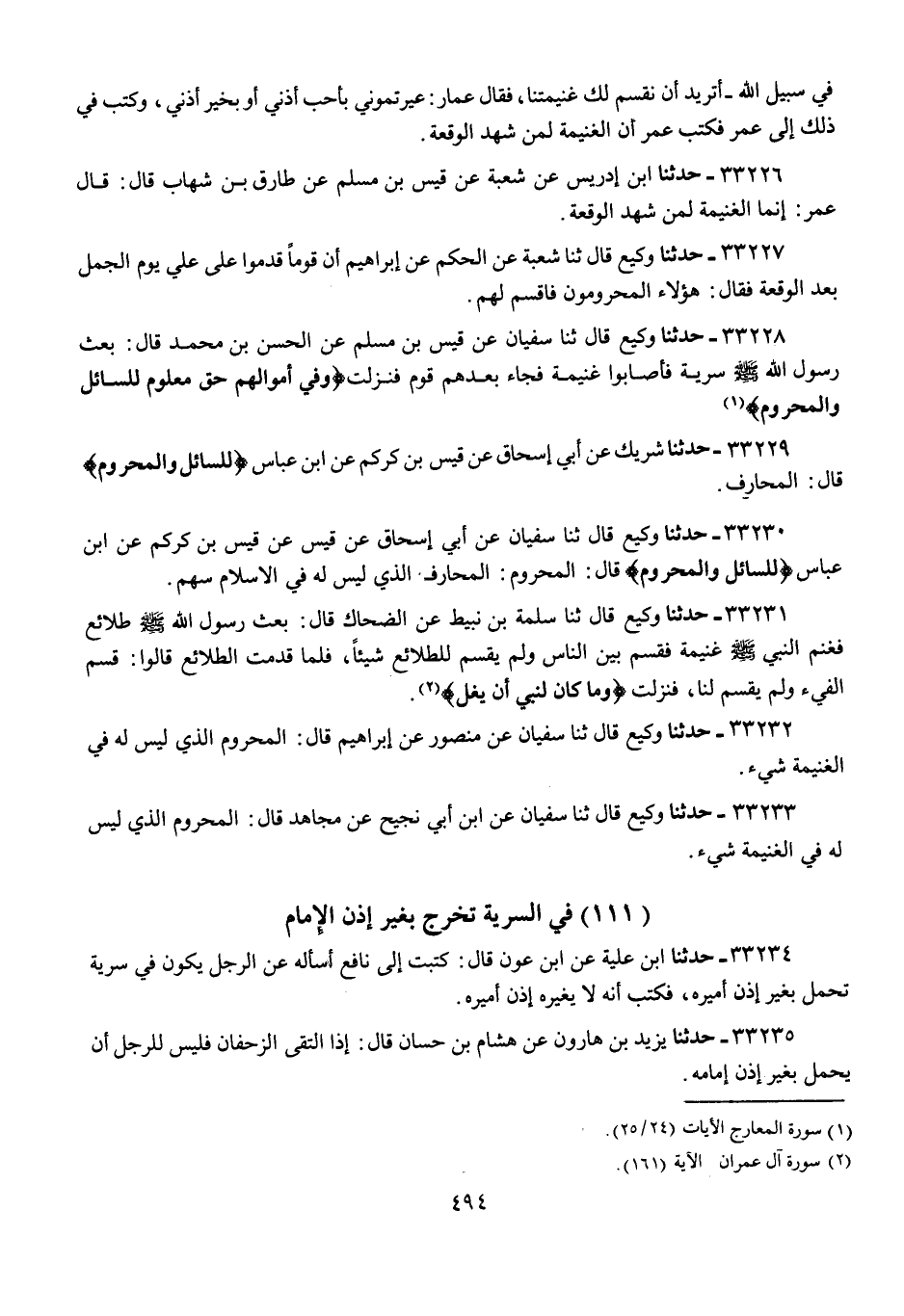33228 - حَدَّثَنَا وَكِيعٌ قَالَ: ثنا سُفْيَانُ، عَنْ قَيْسِ بْنِ مُسْلِمٍ، عَنِ الْحَسَنِ بْنِ مُحَمَّدٍ قَالَ: بَعَثَ رَسُولُ اللَّهِ صَلَّى اللهُ عَلَيْهِ وَسَلَّمَ سَرِيَّةً فَأَصَابُوا غَنِيمَةً فَجَاءَ بَعْدَهُمْ قَوْمٌ فَنَزَلَتْ: «§وَالَّذِينَ فِي أَمْوَالِهِمْ حَقٌّ مَعْلُومٌ لِلسَّائِلِ وَالْمَحْرُومِ»