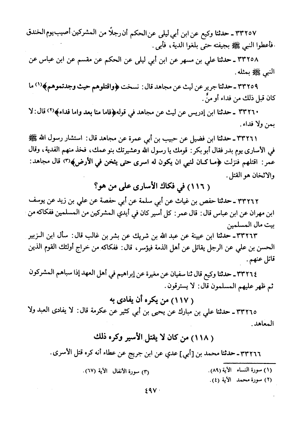 33266 - حَدَّثَنَا مُحَمَّدُ بْنُ عَدِيٍّ، عَنِ ابْنِ جُرَيْجٍ، عَنْ عَطَاءٍ، أَنَّهُ «§كَرِهَ قَتْلَ الْأَسْرَى»