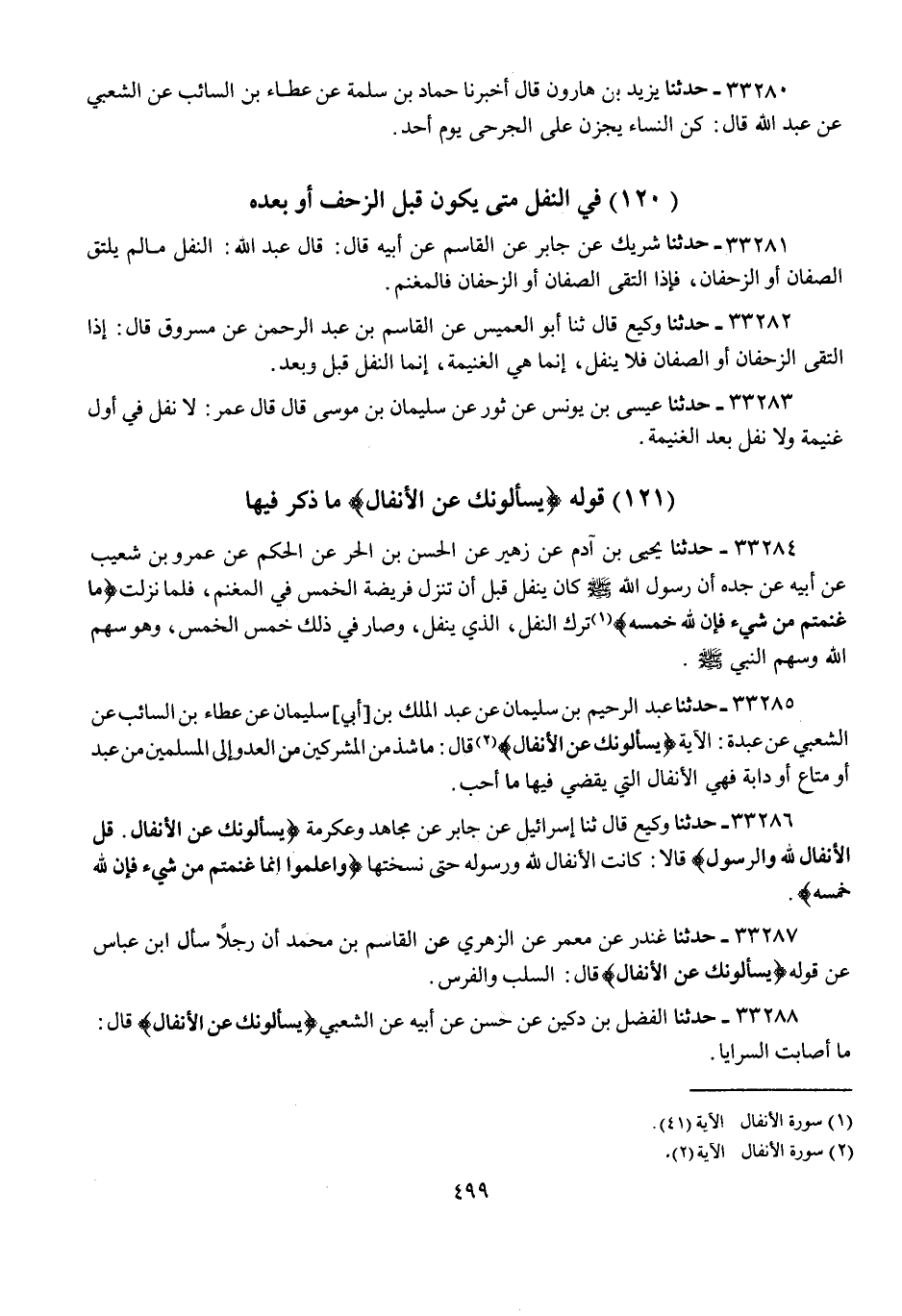 33285 - حَدَّثَنَا عَبْدُ الرَّحِيمِ بْنُ سُلَيْمَانَ، عَنْ عَبْدِ الْمَلِكِ بْنِ سُلَيْمَانَ، عَنْ عَطَاءِ بْنِ السَّائِبِ، عَنِ الشَّعْبِيِّ، عَنْ عَبْدَةَ الْآيَةَ {يَسْأَلُونَكَ عَنِ الْأَنْفَالِ} [الأنفال: 1] قَالَ: «§مَا شَذَّ مِنَ الْمُشْرِكِينَ مِنَ الْعَدُوِّ إِلَى الْمُسْلِمِينَ مِنْ عَبْدٍ، أَوْ مَتَاعٍ، أَوْ دَابَّةٍ فَهِيَ الْأَنْفَالُ الَّتِي يَقْضِي فِيهَا مَا أَحَبَّ»