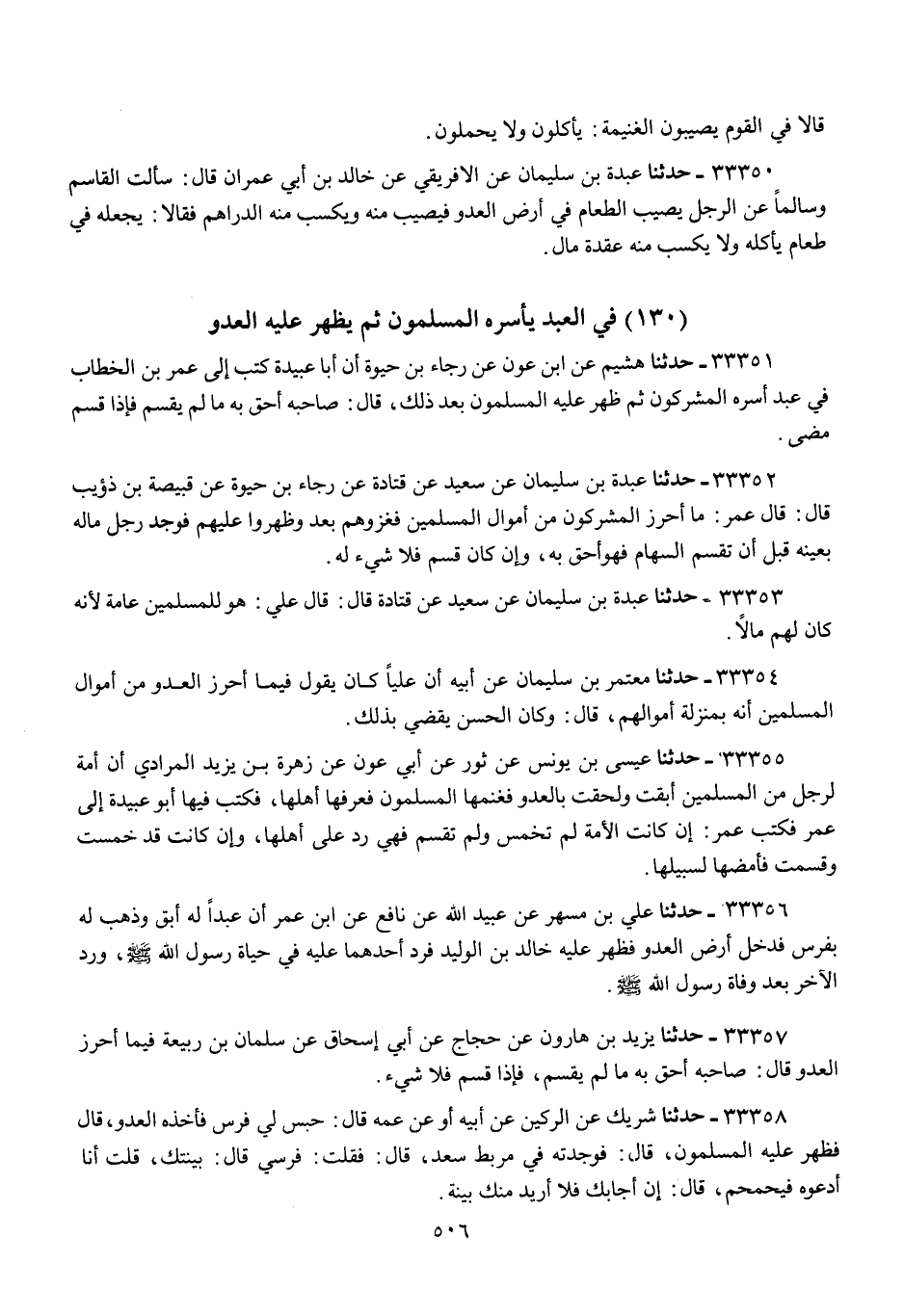 33352 - حَدَّثَنَا عَبْدَةُ بْنُ سُلَيْمَانَ، عَنْ سَعِيدٍ، عَنْ قَتَادَةَ، عَنْ رَجَاءِ بْنِ حَيْوَةَ، عَنْ قَبِيصَةَ بْنِ ذُؤَيْبٍ قَالَ: قَالَ عُمَرُ: «§مَا أَحْرَزَ الْمُشْرِكُونَ مِنْ أَمْوَالِ الْمُسْلِمِينَ فَغَزَوْهُمْ بَعْدُ وَظَهَرُوا عَلَيْهِمْ فَوَجَدَ رَجُلٌ مَالَهُ بِعَيْنِهِ قَبْلَ أَنْ تُقْسَمَ السِّهَامُ فَهُوَ أَحَقُّ بِهِ، وَإِنْ كَانَ قُسِمَ فَلَا شَيْءَ لَهُ»