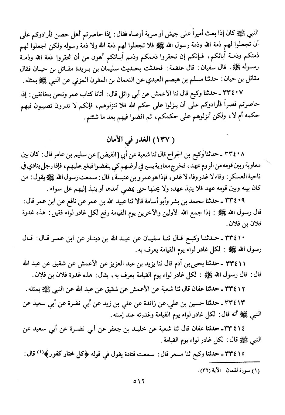 33410 - حَدَّثَنَا وَكِيعٌ قَالَ: ثنا سُفْيَانُ، عَنْ عَبْدِ اللَّهِ بْنِ دِينَارٍ، عَنِ ابْنِ عُمَرَ قَالَ: قَالَ رَسُولُ اللَّهِ صَلَّى اللهُ عَلَيْهِ وَسَلَّمَ: «§لِكُلِّ غَادِرٍ لِوَاءٌ يَوْمَ الْقِيَامَةِ يُعْرَفُ بِهِ»