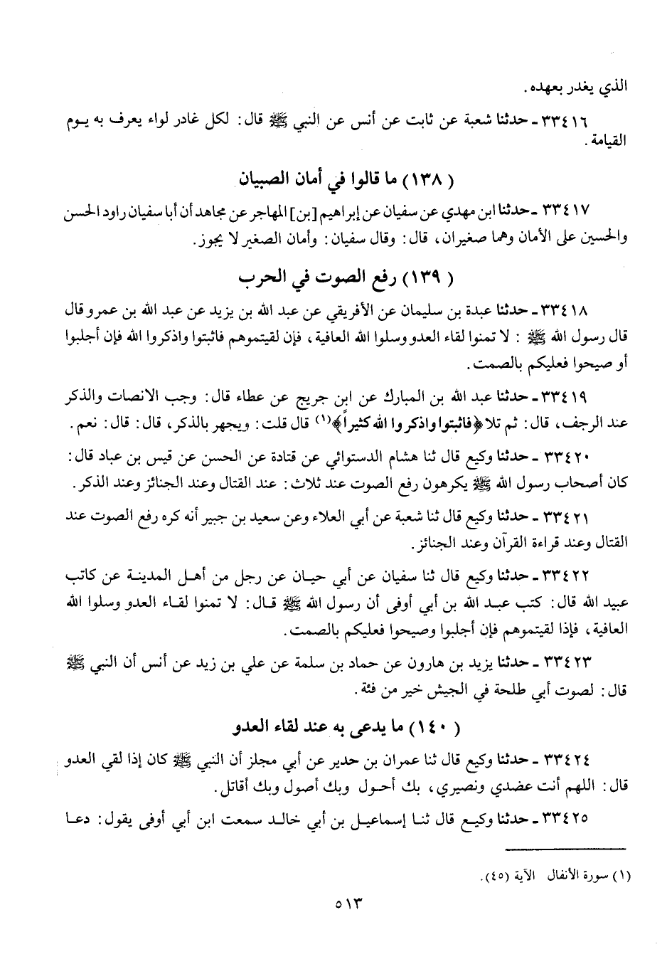 33421 - حَدَّثَنَا وَكِيعٌ قَالَ: ثنا شُعْبَةُ، عَنْ أَبِي الْعَلَاءِ، وَعَنْ سَعِيدِ بْنِ جُبَيْرٍ أَنَّهُ «§كَرِهَ رَفْعَ الصَّوْتِ عِنْدَ الْقِتَالِ، وَعِنْدَ قِرَاءَةِ الْقُرْآنِ وَعِنْدَ الْجَنَائِزِ»
