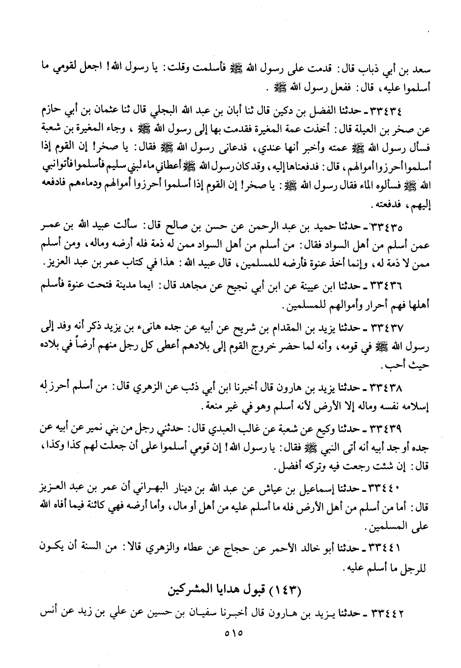 33434 - حَدَّثَنَا الْفَضْلُ بْنُ دُكَيْنٍ قَالَ: ثنا أَبَانُ بْنُ عَبْدِ اللَّهِ الْبَجَلِيُّ قَالَ: ثنا عُثْمَانُ بْنُ أَبِي حَازِمٍ، عَنْ صَخْرِ بْنِ الْعَيْلَةِ قَالَ: أَخَذْتُ عَمَّةَ الْمُغِيرَةِ فَقَدِمْتُ بِهَا إِلَى رَسُولِ اللَّهِ صَلَّى اللهُ عَلَيْهِ وَسَلَّمَ وَجَاءَ الْمُغِيرَةُ بْنُ شُعْبَةَ فَسَأَلَ رَسُولَ اللَّهِ صَلَّى اللهُ عَلَيْهِ وَسَلَّمَ عَمَّتَهُ وَأَخْبَرَ أَنَّهَا عِنْدِي، فَدَعَانِي رَسُولُ اللَّهِ صَلَّى اللهُ عَلَيْهِ وَسَلَّمَ: §يَا صَخْرُ، إِنَّ الْقَوْمَ إِذَا أَسْلَمُوا أَحْرَزُوا أَمْوَالَهُمْ، قَالَ: فَدَفَعْنَاهَا إِلَيْهِ، وَقَدْ كَانَ رَسُولُ اللَّهِ صَلَّى اللهُ عَلَيْهِ وَسَلَّمَ أَعْطَانِي مَاءً لِبَنِي سُلَيْمٍ فَأَسْلَمُوا فَأَتَوْا نَبِيَّ اللَّهِ صَلَّى اللهُ عَلَيْهِ وَسَلَّمَ فَسَأَلُوهُ الْمَاءَ فَقَالَ رَسُولُ اللَّهِ صَلَّى اللهُ عَلَيْهِ وَسَلَّمَ: «يَا صَخْرُ، إِنَّ الْقَوْمَ إِذَا أَسْلَمُوا أَحْرَزُوا أَمْوَالَهُمْ، وَدِمَاءَهُمْ فَادْفَعْهُ إِلَيْهِمْ فَدَفَعْتُهُ»