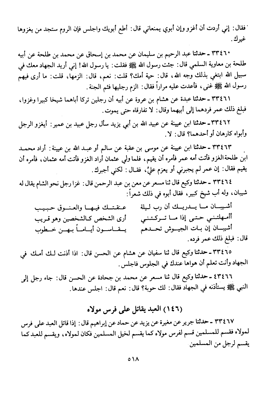 33464 - حَدَّثَنَا وَكِيعٌ قَالَ: ثنا مِسْعَرٌ، عَنْ مَعْنِ بْنِ عَبْدِ الرَّحْمَنِ قَالَ: §غَزَا رَجُلٌ نَحْوَ الشَّامِ يُقَالُ لَهُ شَيْبَانُ، وَلَهُ أَبٌ شَيْخٌ كَبِيرٌ، فَقَالَ أَبُوهُ فِي ذَلِكَ شِعْرًا: