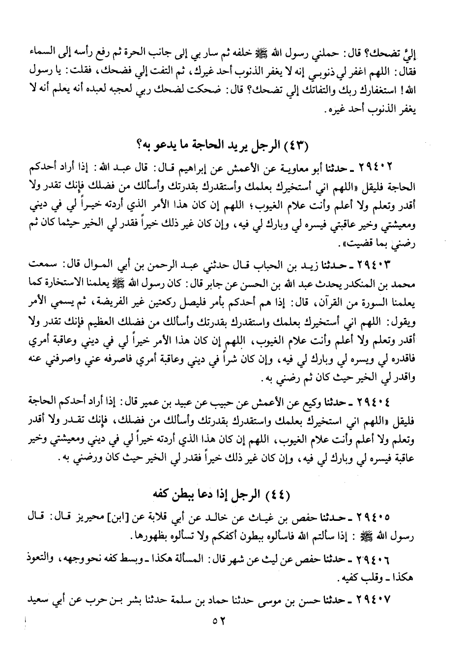 29402 - حَدَّثَنَا أَبُو مُعَاوِيَةَ، عَنِ الْأَعْمَشِ، عَنْ إِبْرَاهِيمَ، قَالَ: قَالَ عَبْدُ اللَّهِ: " §إِذَا أَرَادَ أَحَدُكُمُ الْحَاجَةَ فَلْيَقُلِ: اللَّهُمَّ إِنِّي أَسْتَخِيرُكَ بِعِلْمِكَ، وَأَسْتَقْدِرُكَ بِقُدْرَتِكَ، وَأَسْأَلُكَ مِنْ فَضْلِكَ، فَإِنَّكَ تَقْدِرُ وَلَا أَقْدِرُ، وَتَعْلَمُ وَلَا أَعْلَمُ، وَأَنْتَ عَلَّامُ الْغُيُوبِ، اللَّهُمَّ إِنْ كَانَ هَذَا الْأَمْرَ الَّذِي أَرَدْتُهُ خَيْرًا لِي فِي دِينِي وَمَعِيشَتِي وَخَيْرِ عَاقِبَتِي فَيَسِّرْهُ لِي، وَبَارِكْ لِي فِيهِ، وَإِنْ كَانَ غَيْرُ ذَلِكَ خَيْرًا فَقَدِّرْ لِي الْخَيْرَ حَيْثُمَا كَانَ، ثُمَّ رَضِّنِي بِمَا قَضَيْتَ "